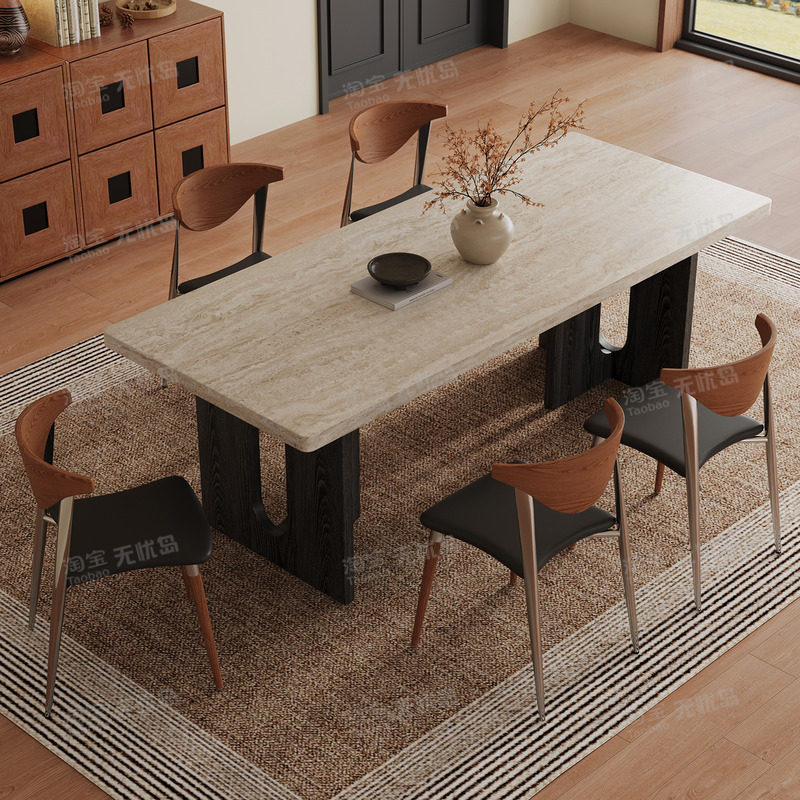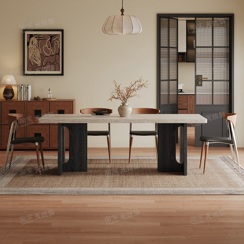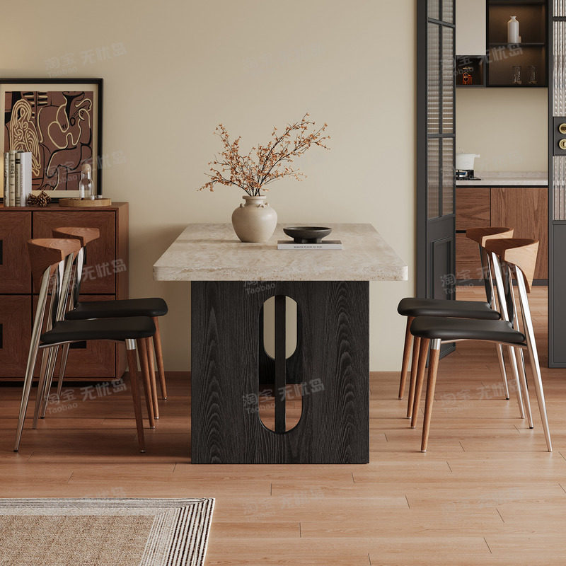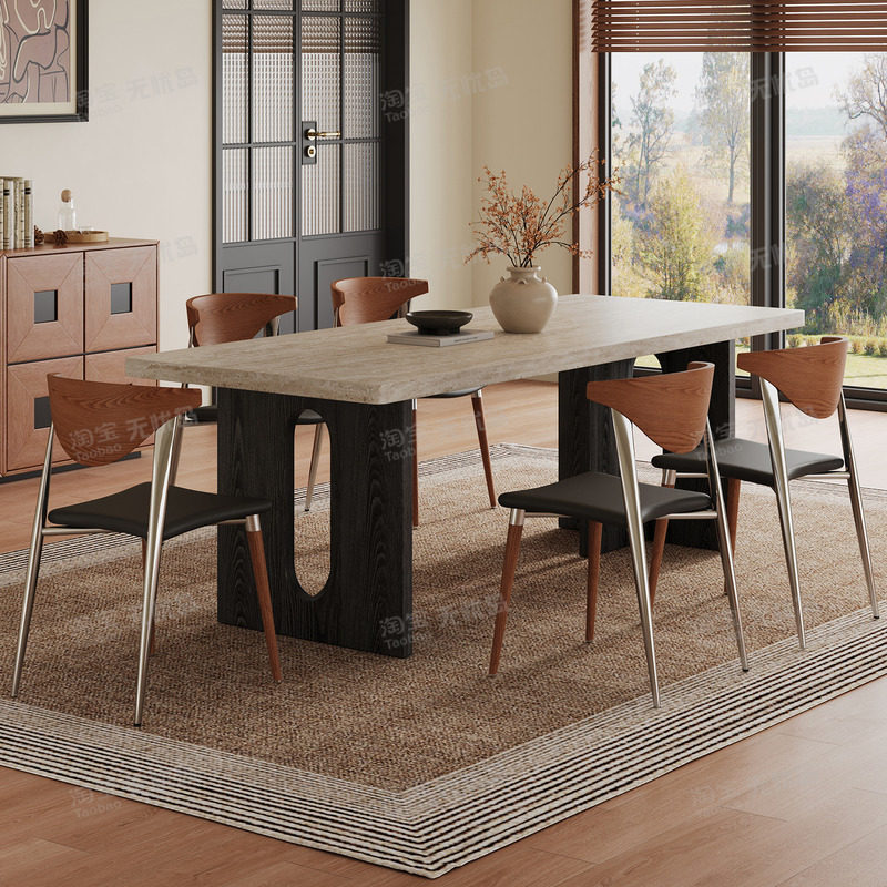 设计师法式复古中古风实木洞石岩板餐桌组合家用长方形吃饭桌子