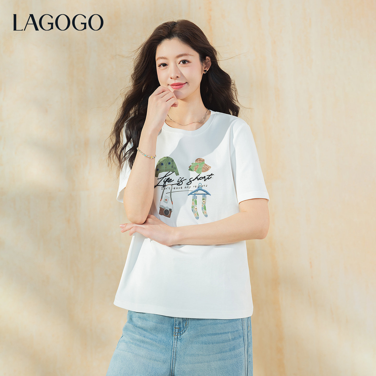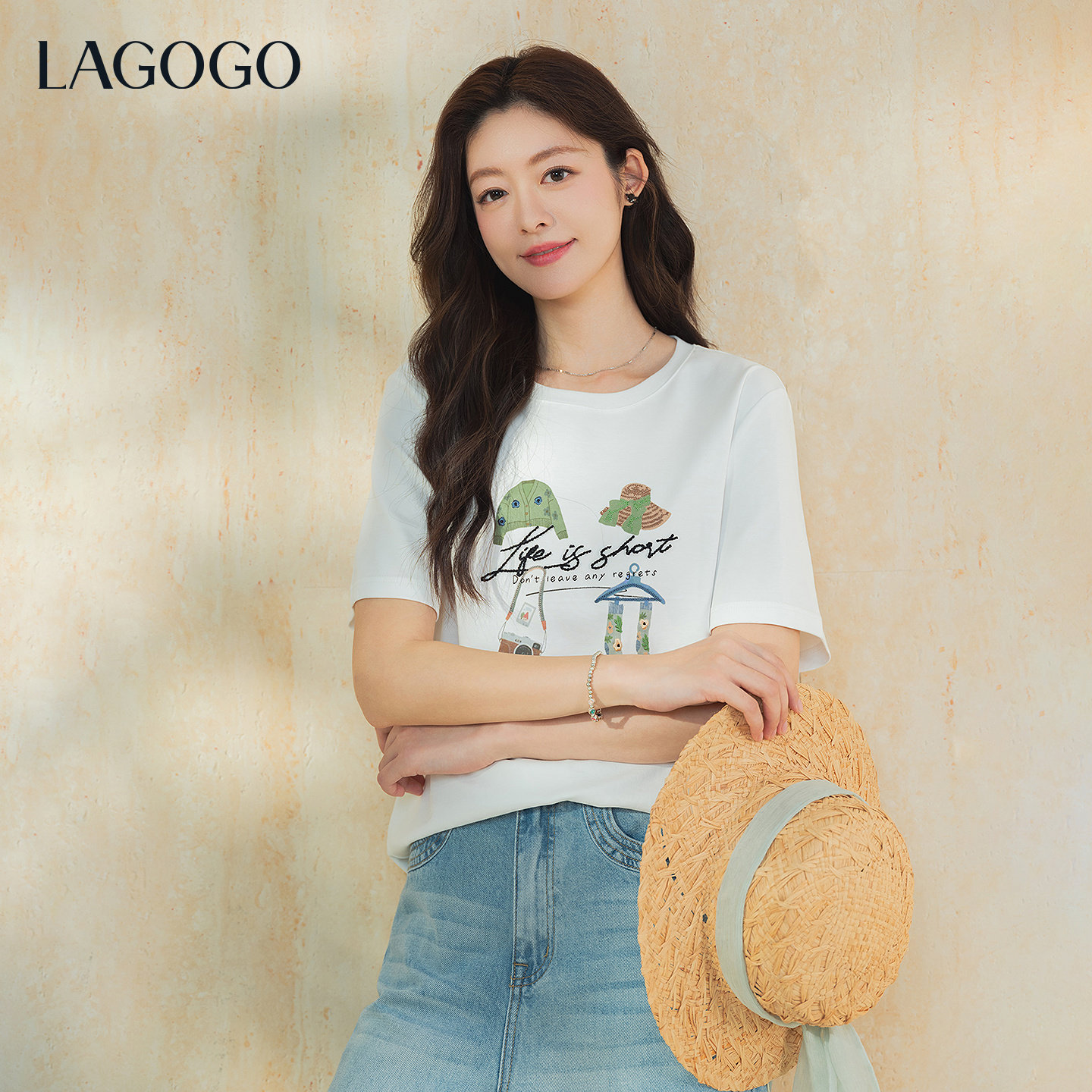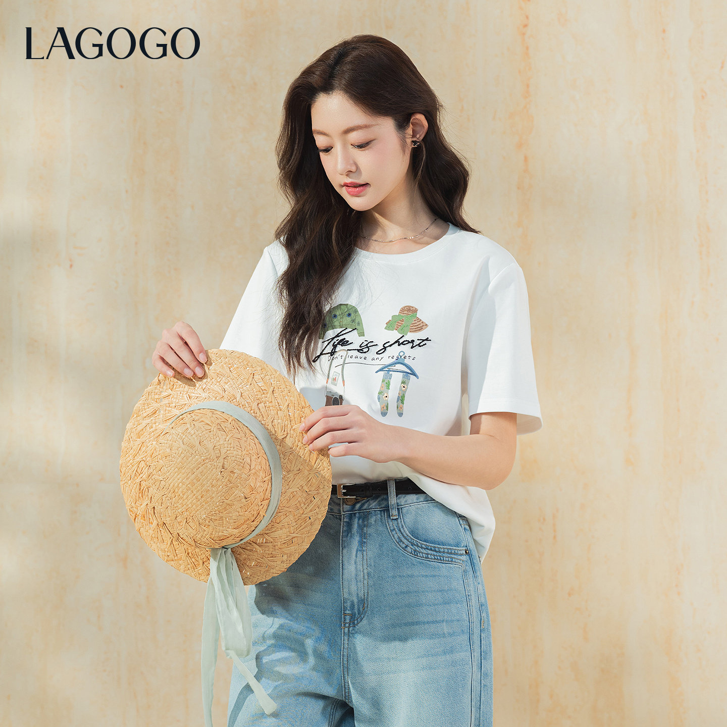 LAGOGO小确幸纯棉正肩短袖T恤女拉谷谷2026春季新款白色绣花上衣