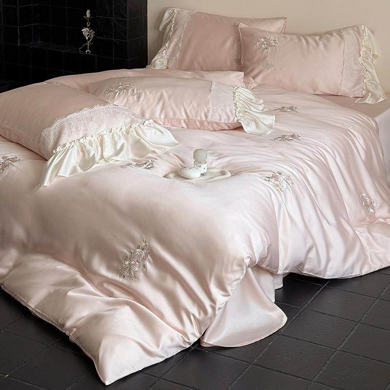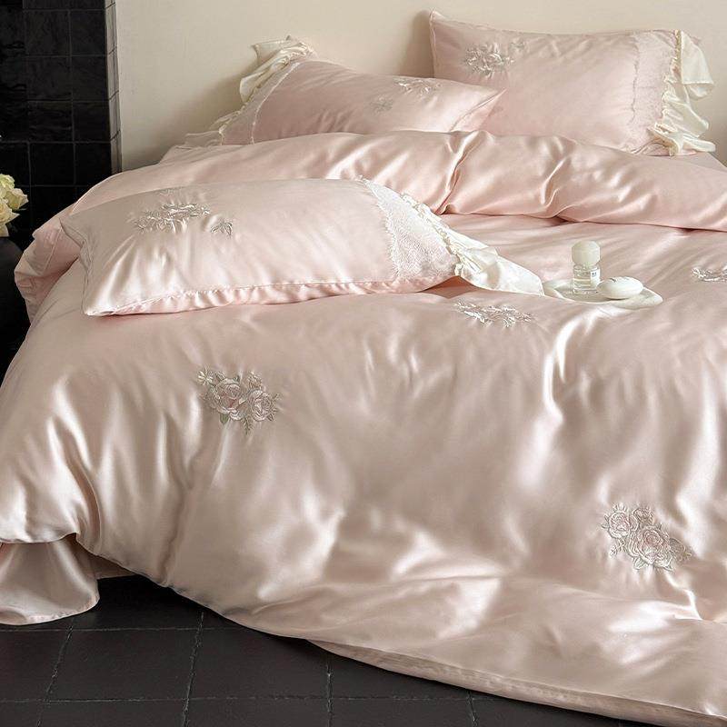 轻奢春夏凉感天丝四件套少女心刺绣被套床单宿舍三件套床笠床品粉