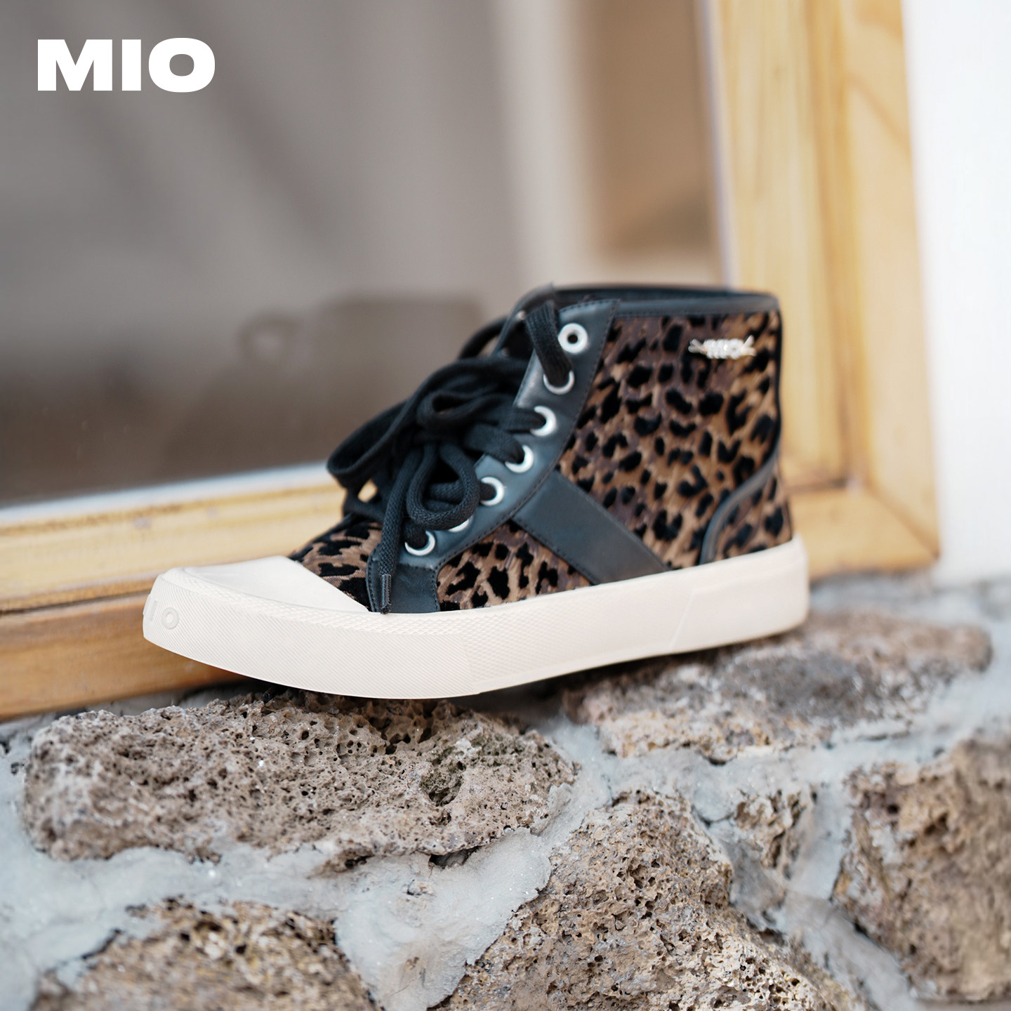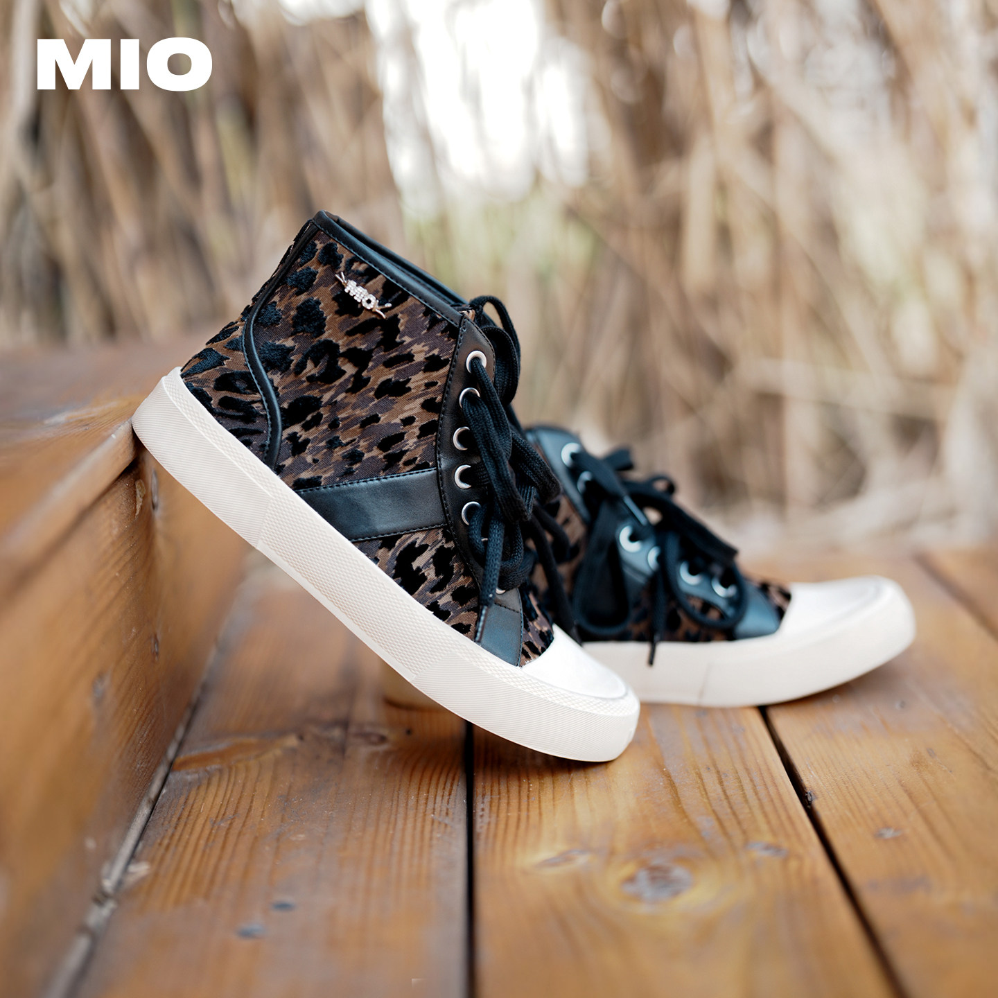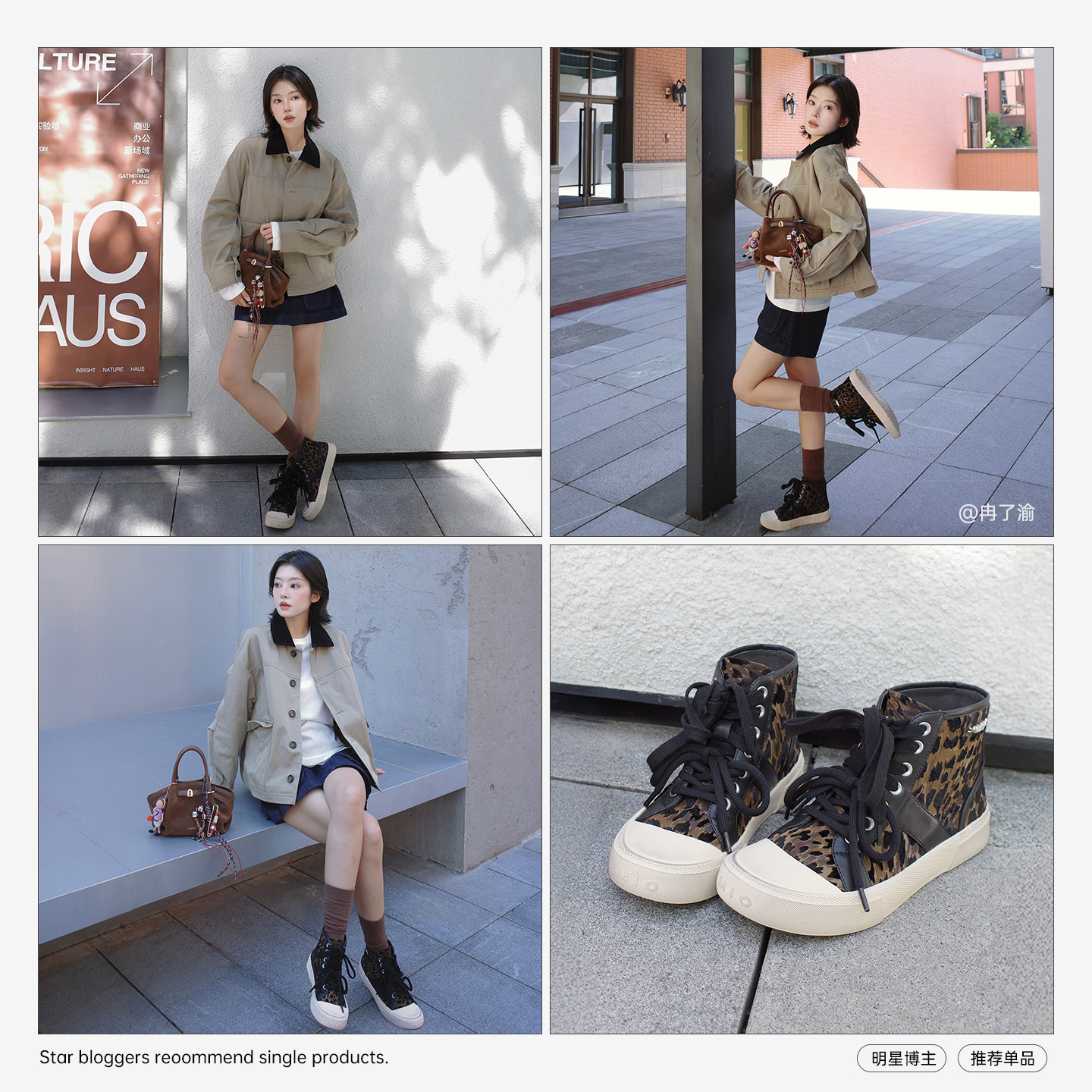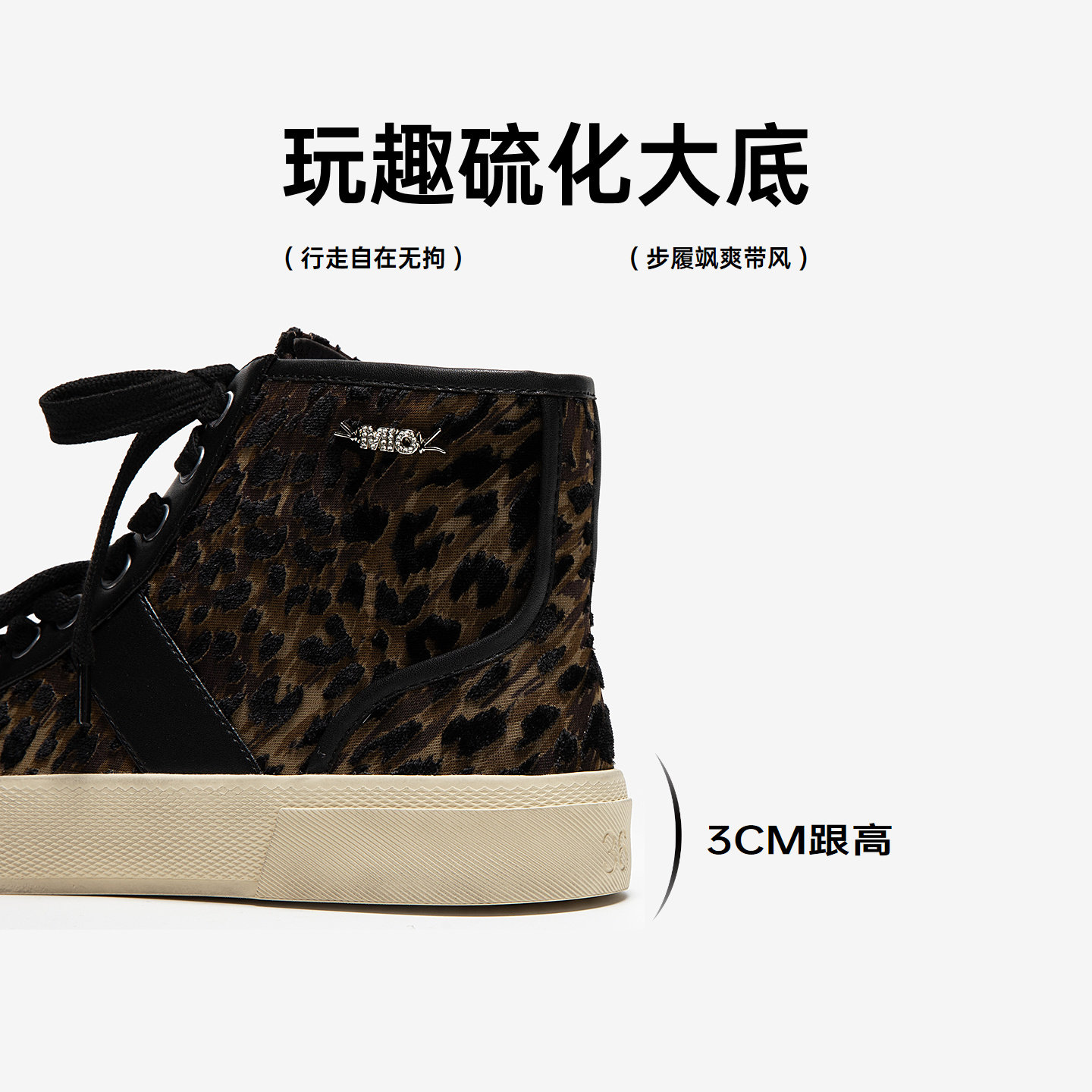 MIO米奥豹纹高帮鞋复古擦色做旧2025冬季新款帆布鞋厚底休闲板鞋