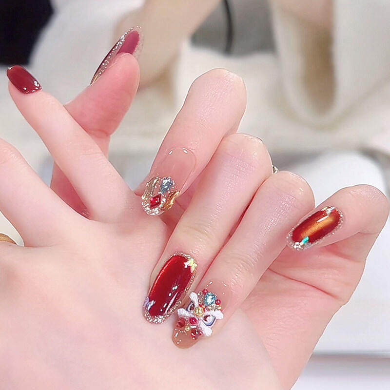 新年大吉立体醒狮手工穿戴甲红色猫眼美甲贴拼钻显白新年中长款