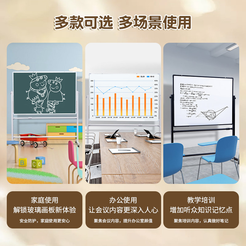 防眩哑光不反光磁性钢化玻璃白板支架式带轮移动办公小黑板可擦家用教学培训班儿童涂鸦画板白色磨砂写字书写
