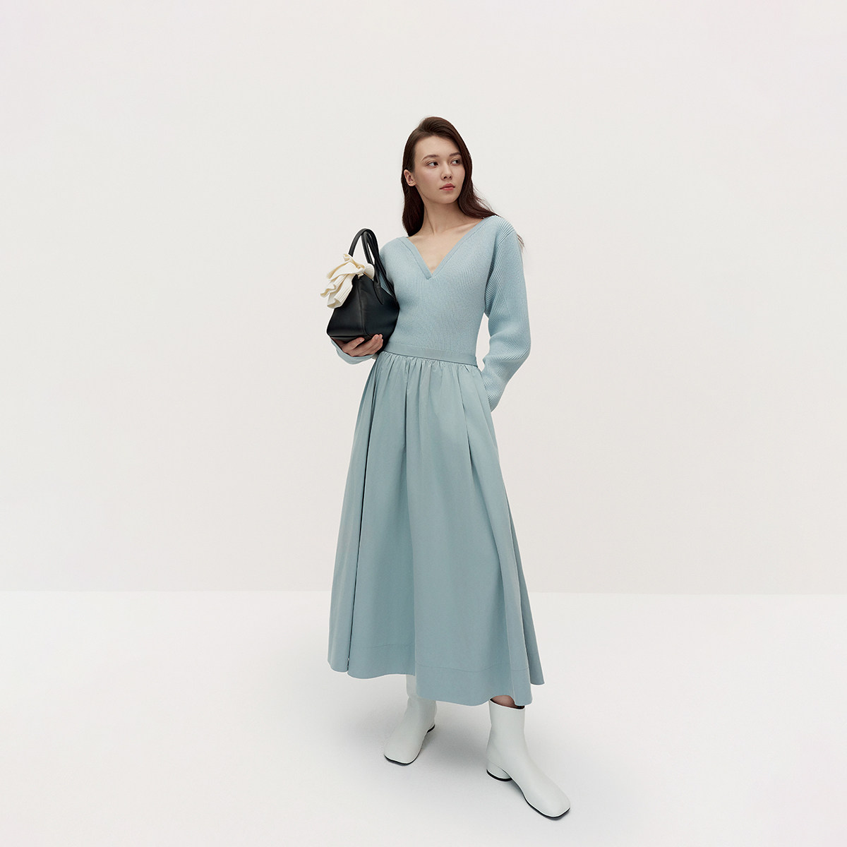 【季末折扣】欧时力 拼接假两件针织连衣裙A字羊腿袖V领秋冬新品