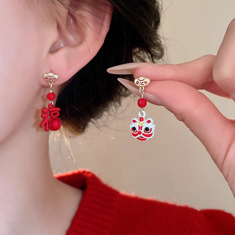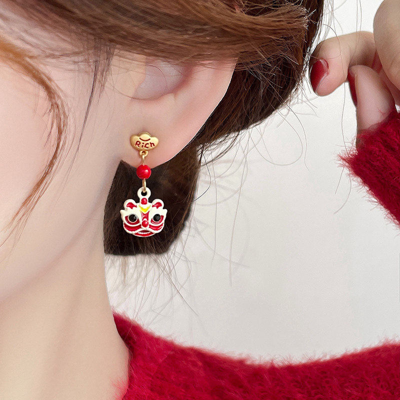 潮上聚美醒狮耳钉中式耳环红色秋冬女2026新款爆款耳饰国潮不对称