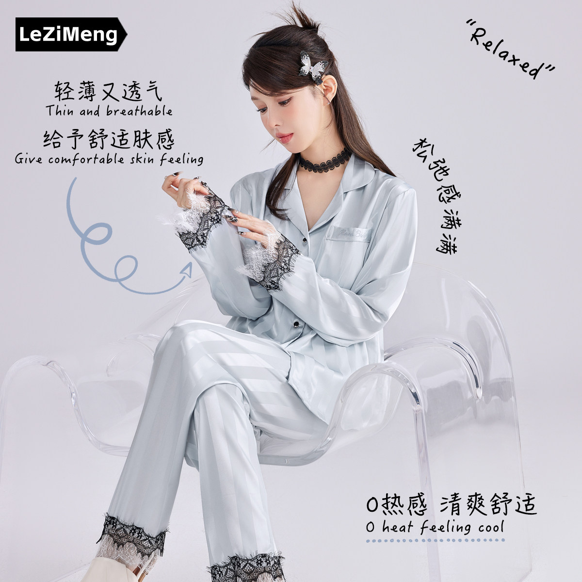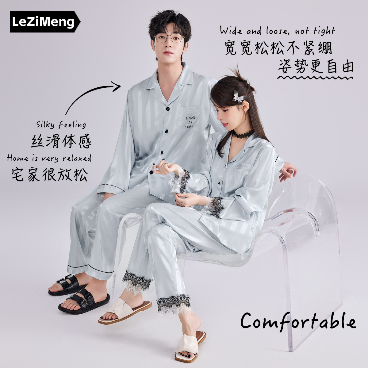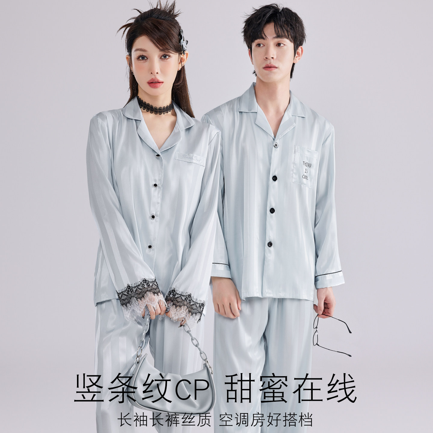 乐姿梦情侣睡衣春夏秋季四季款冰丝长袖长裤套装男女士条纹家居服