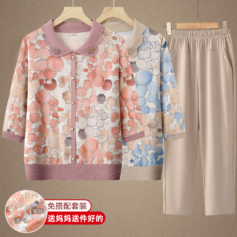 中年妈妈春夏装冰丝小衫T恤中老年人洋气上衣女春秋两件套装薄款