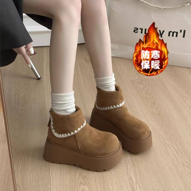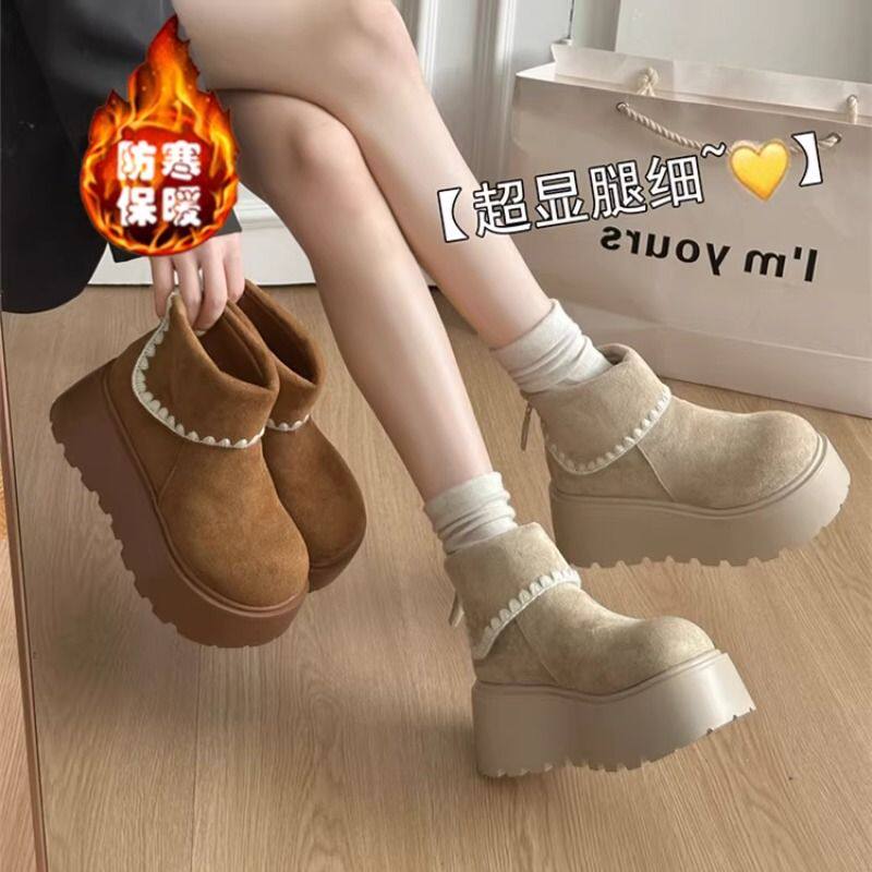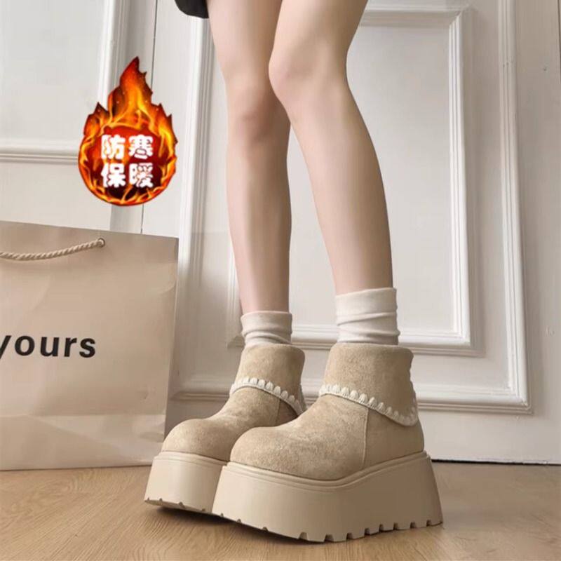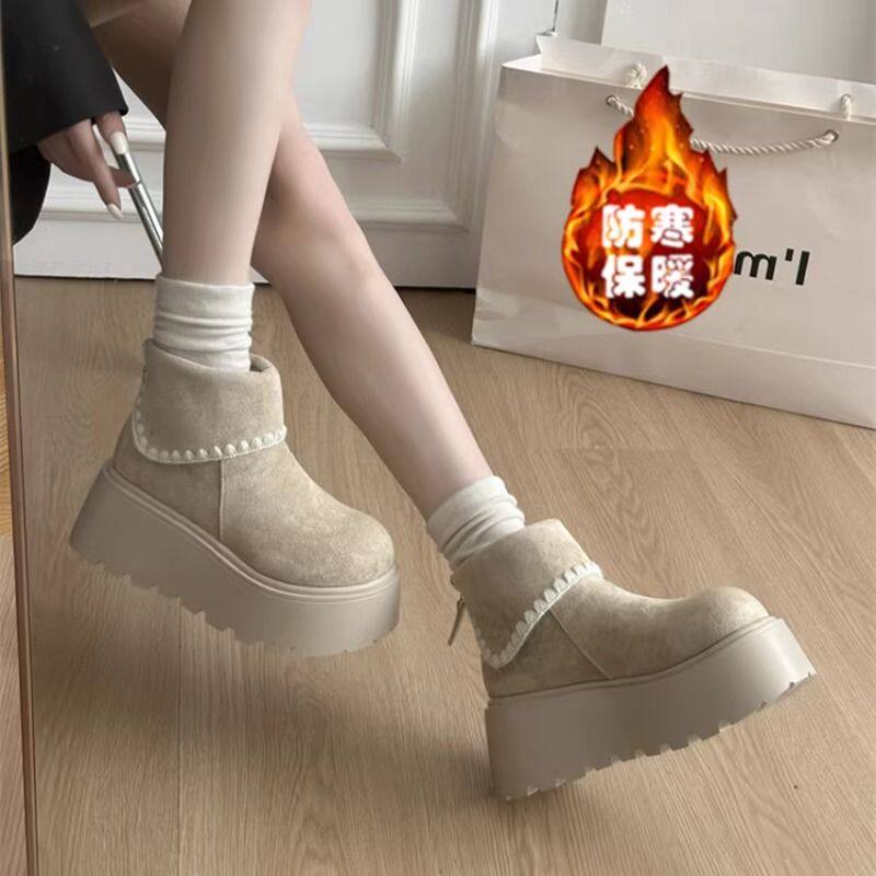 miu家厚底雪地靴女冬季真皮短靴羊毛侧拉链增高厚底加绒毛毛棉鞋