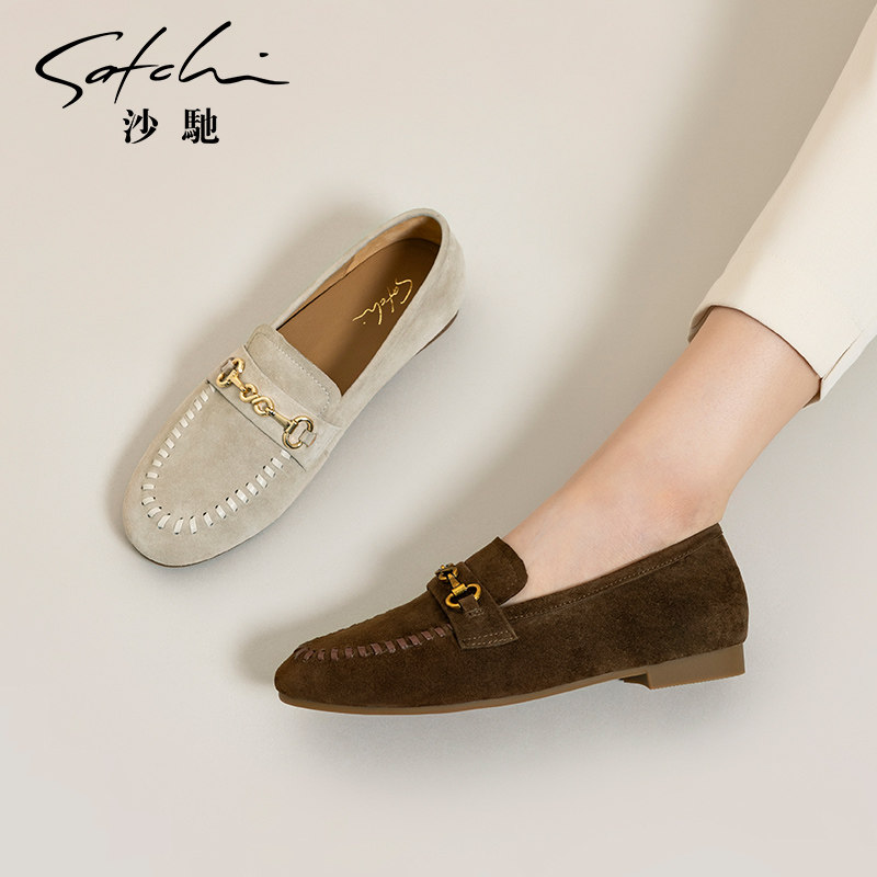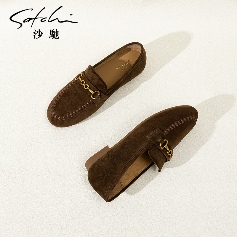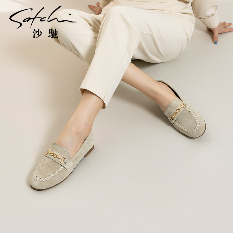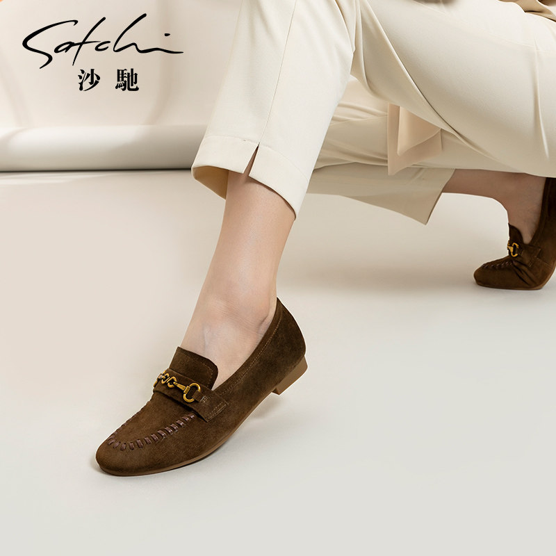 沙驰女鞋舒适羊皮平底单鞋2025年秋冬新款时尚马衔扣潮乐福鞋深口