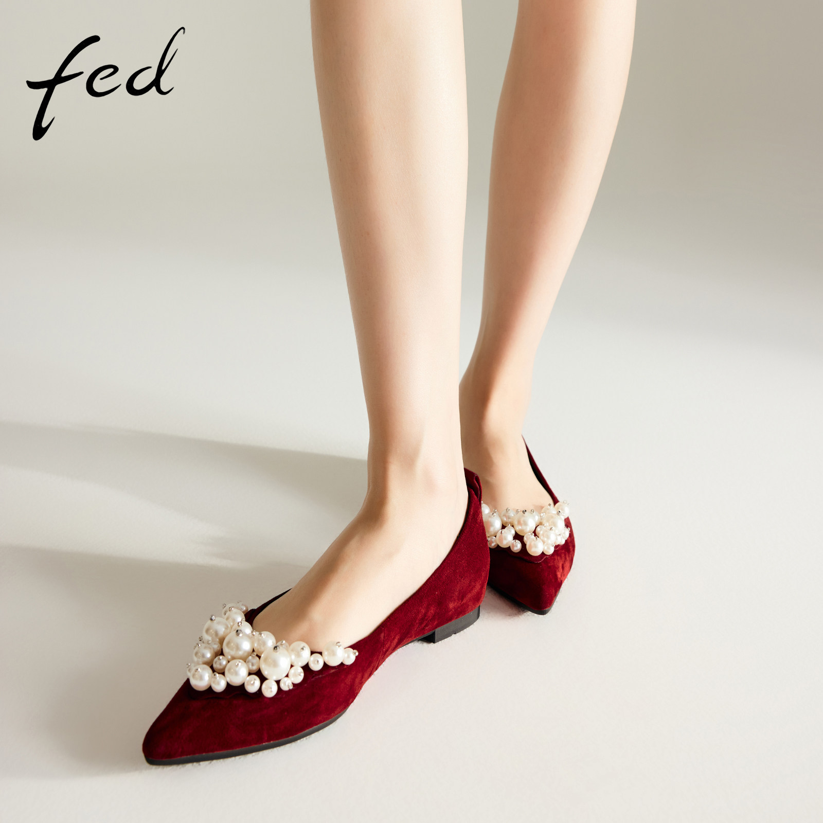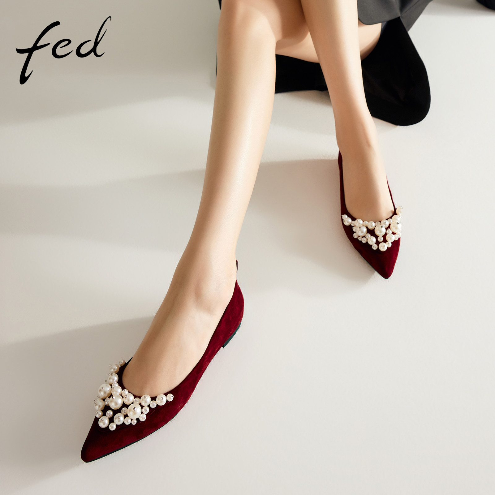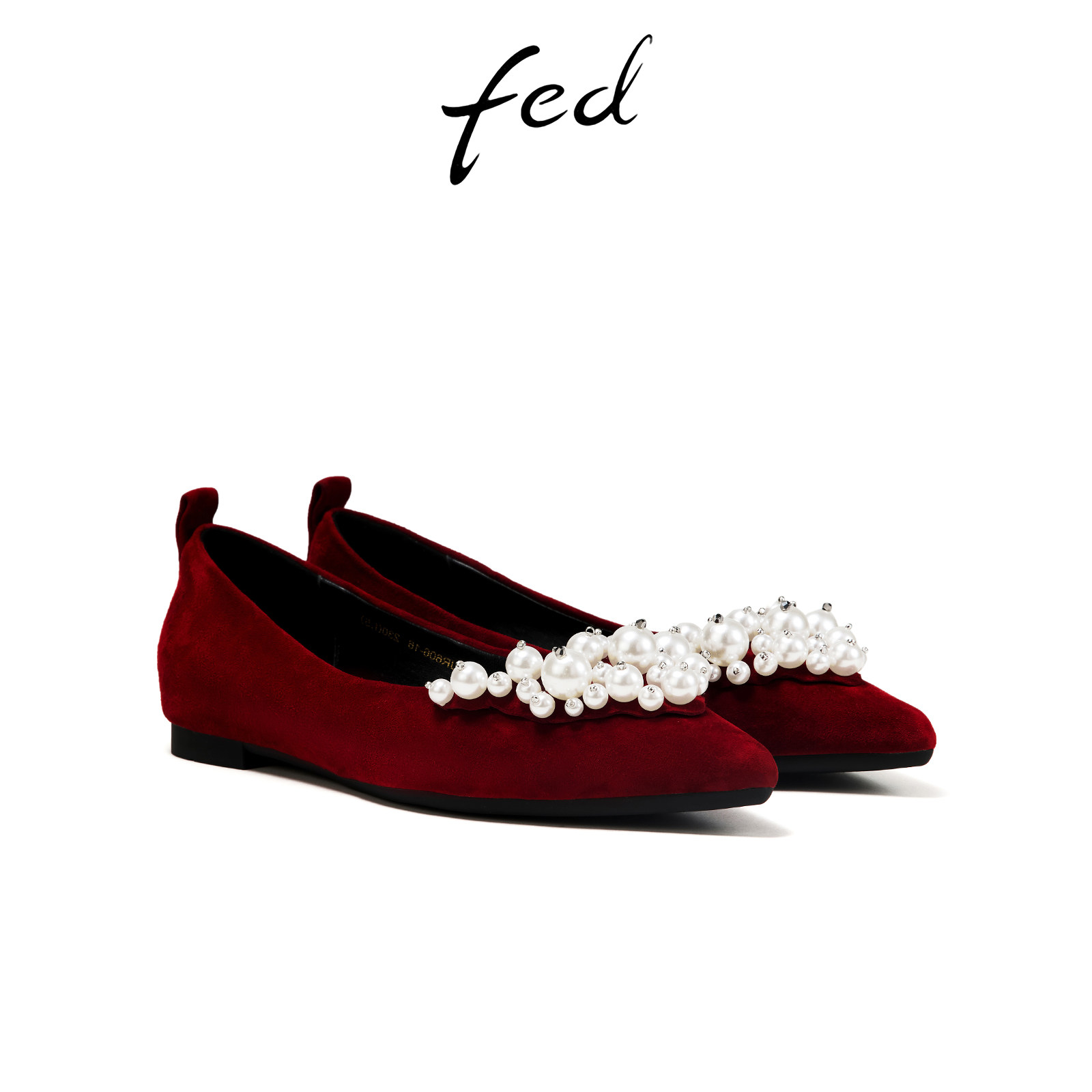 fed尖头单鞋春季新款女鞋秀禾婚鞋红色气质平底鞋女D1128-ZFA606