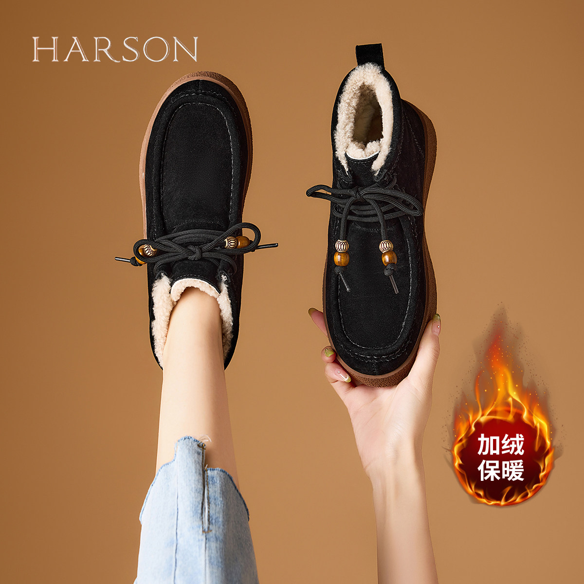 Harson/哈森冬季毛绒雪地靴女加绒加厚保暖系带短靴厚底增高棉鞋