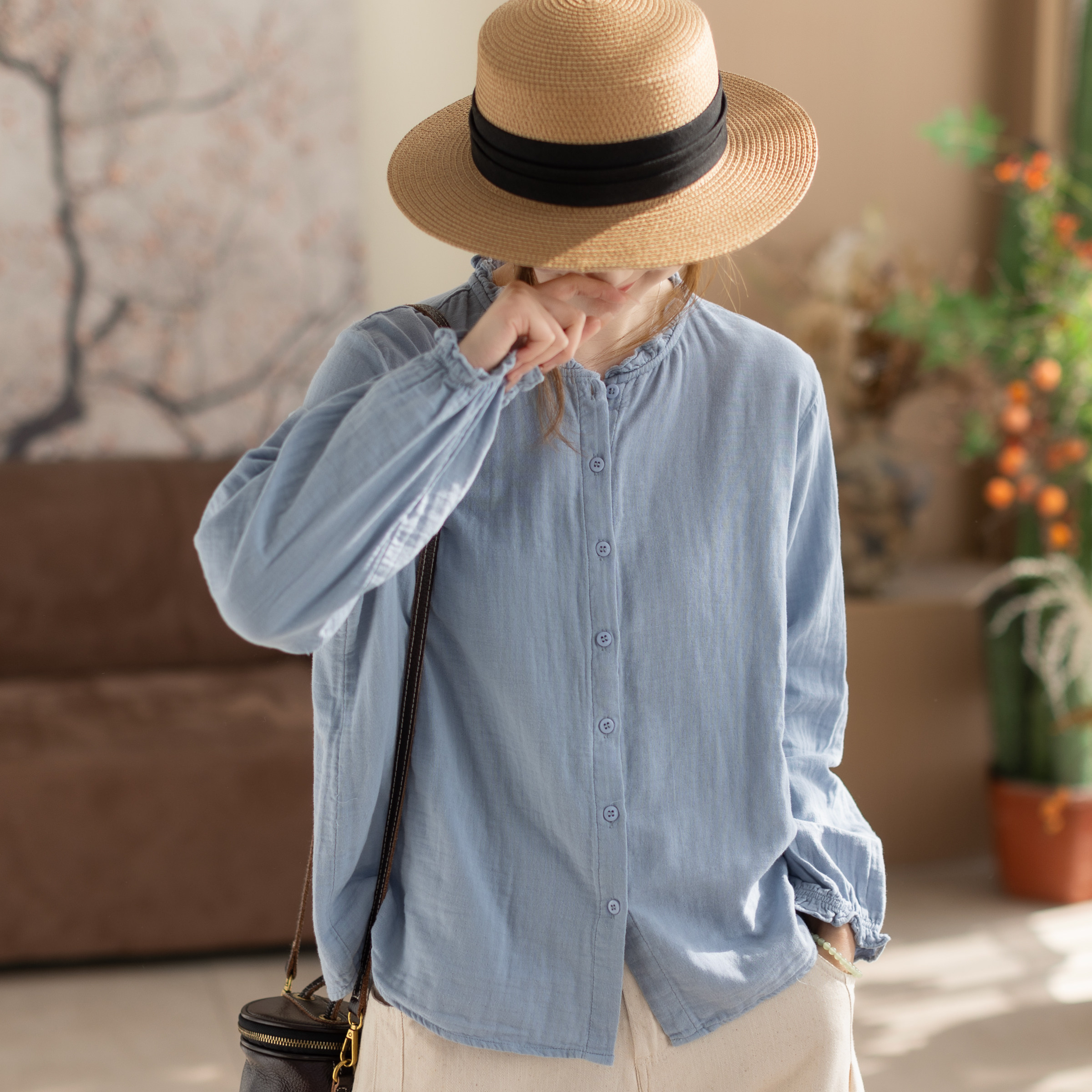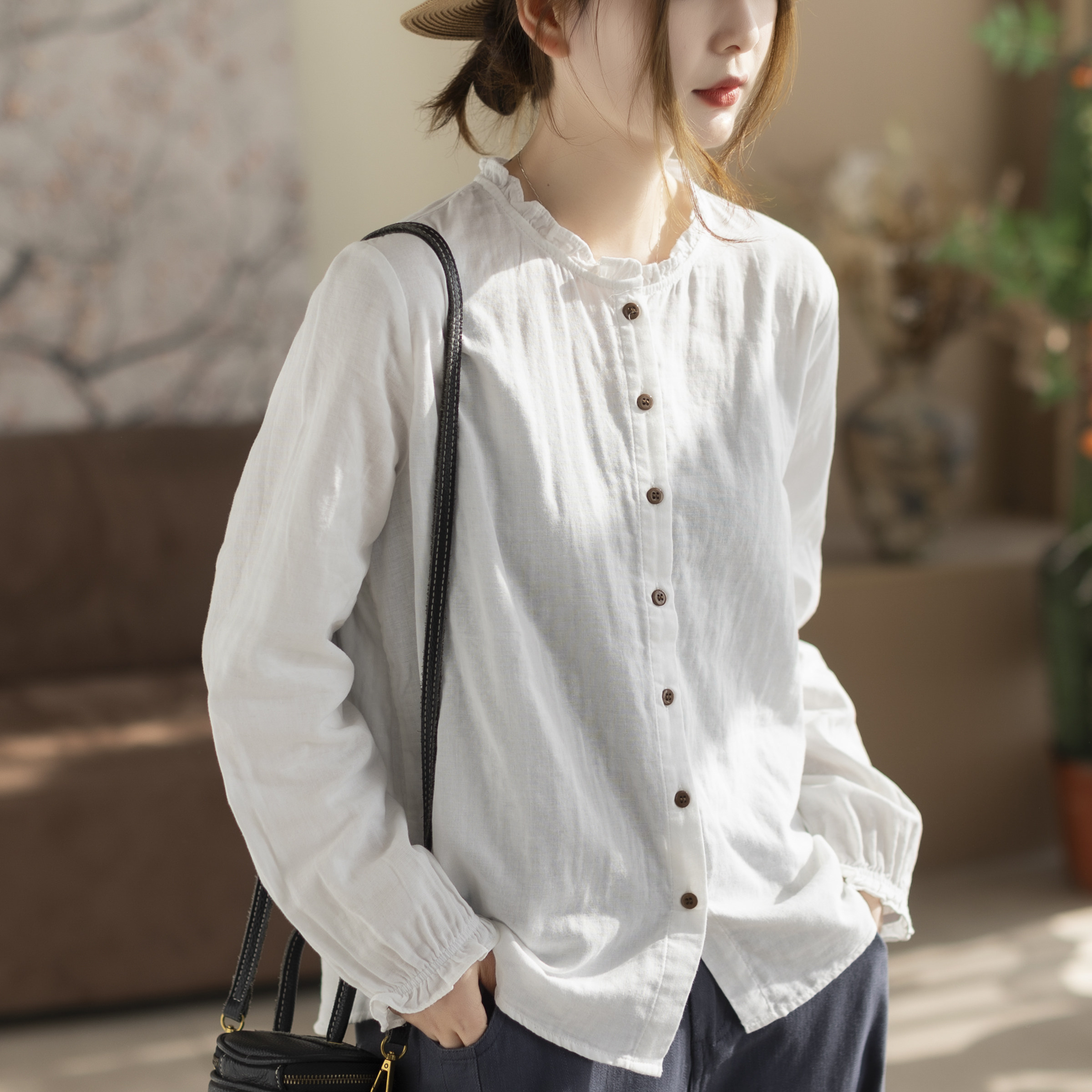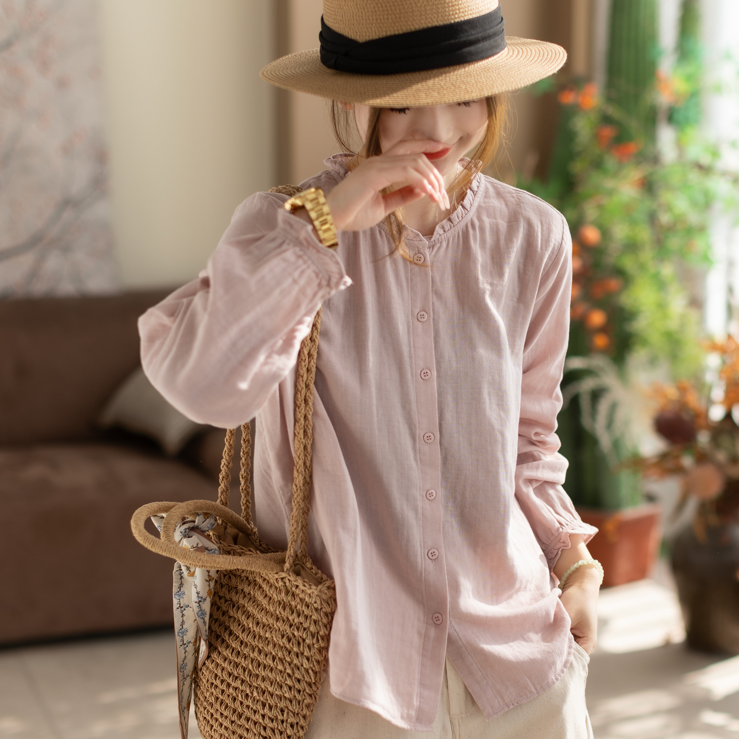 咖咪羽衬衫女春秋新款双层棉纱木耳花边减龄长袖衬衫百搭上衣