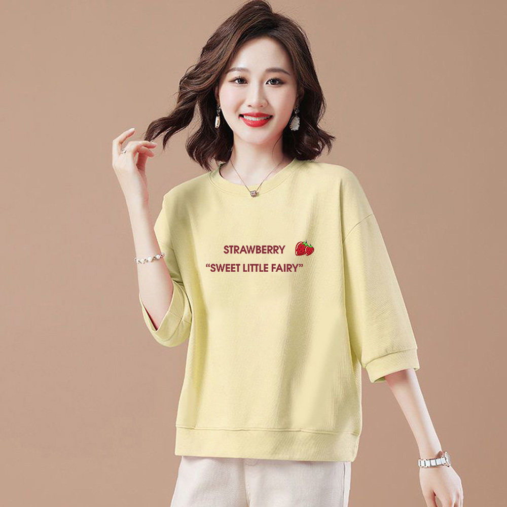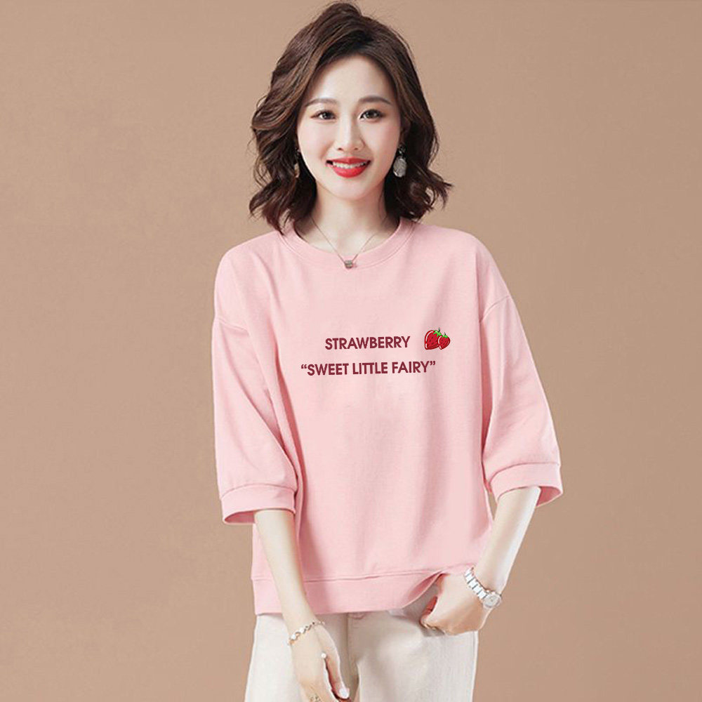 早春秋纯棉七分袖圆领休闲风新款宽松百搭印花套头上衣T恤女纯棉