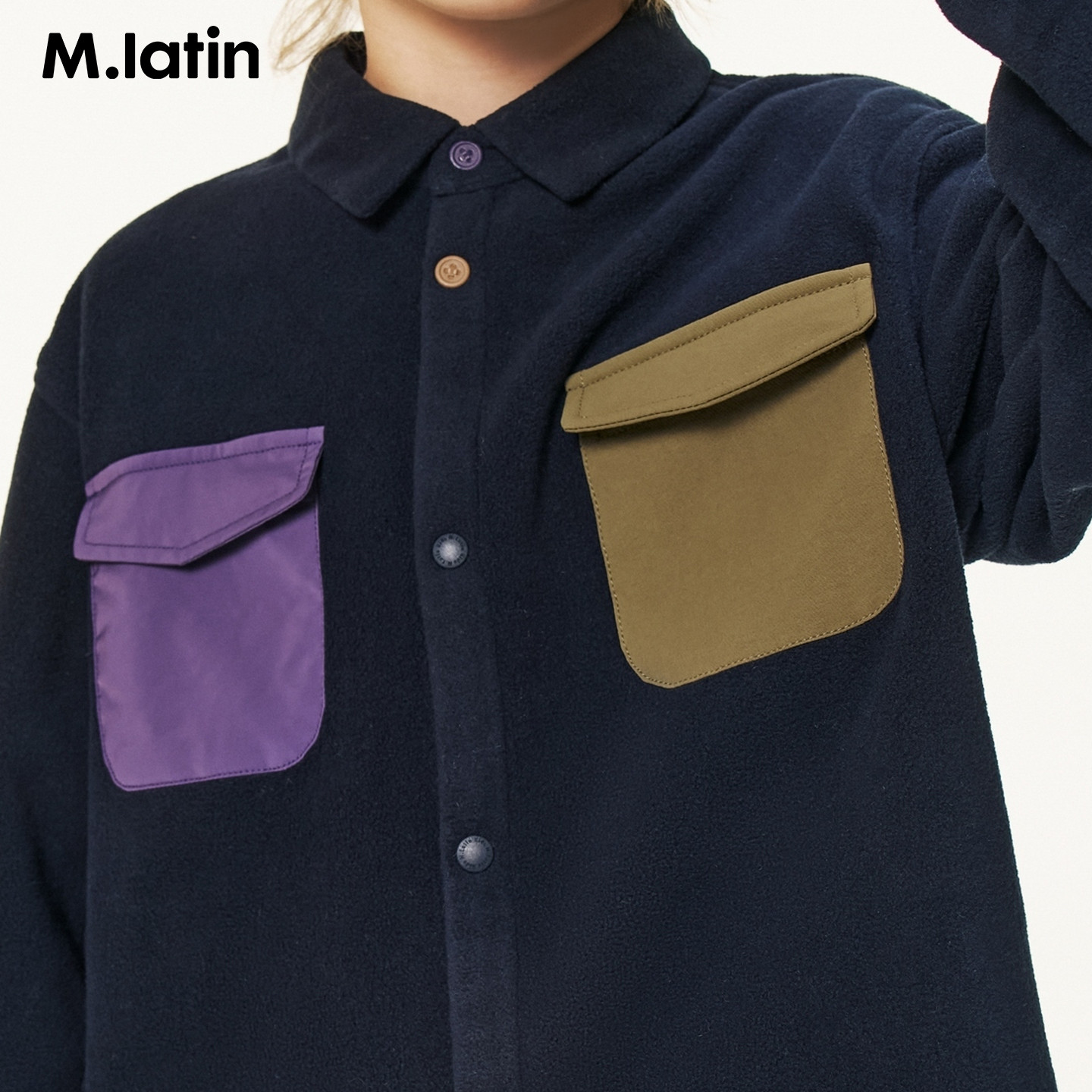 不对称撞色口袋摇粒绒长袖衬衫