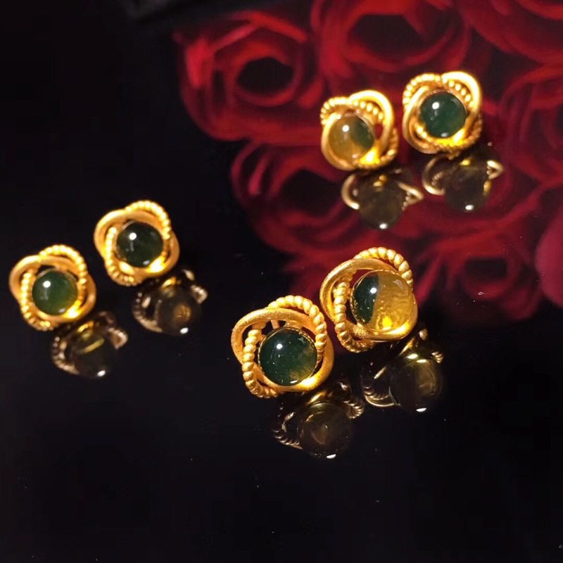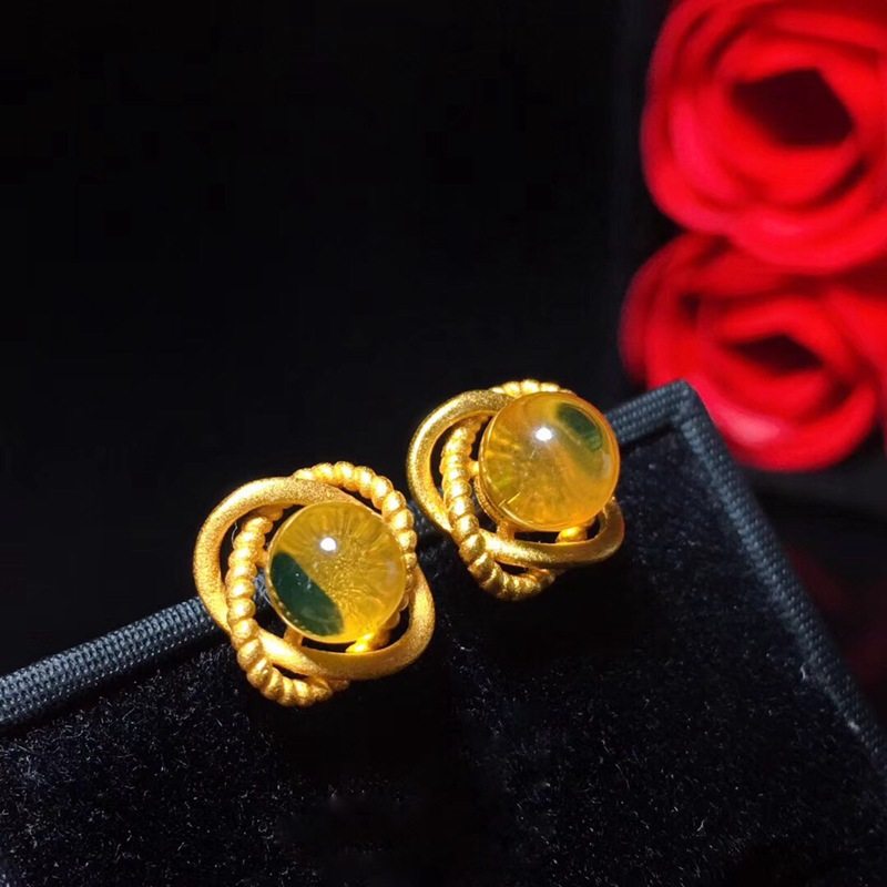 秋冬款耳环天然3A净水琥珀耳钉S925银镀古法金蓝珀耳环时尚男女款