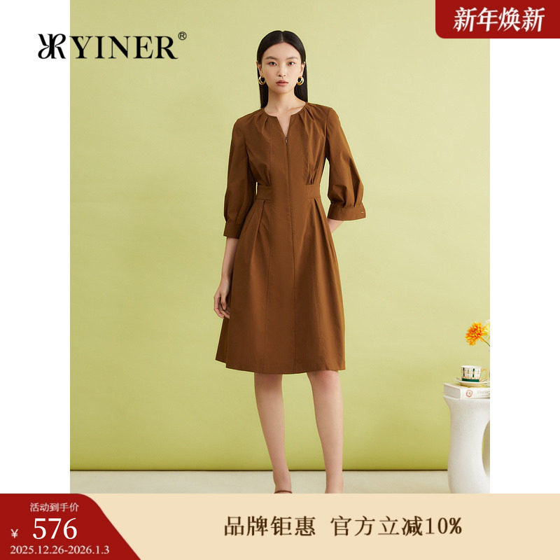 YINER音儿专选夏季法式优雅复古泡泡袖半开领收腰连衣裙