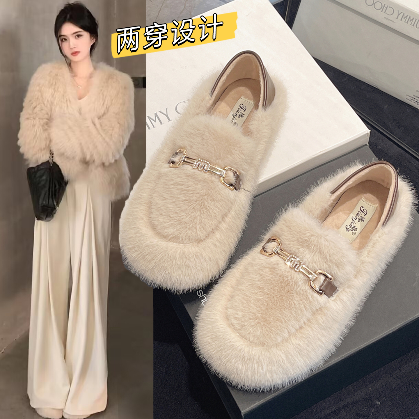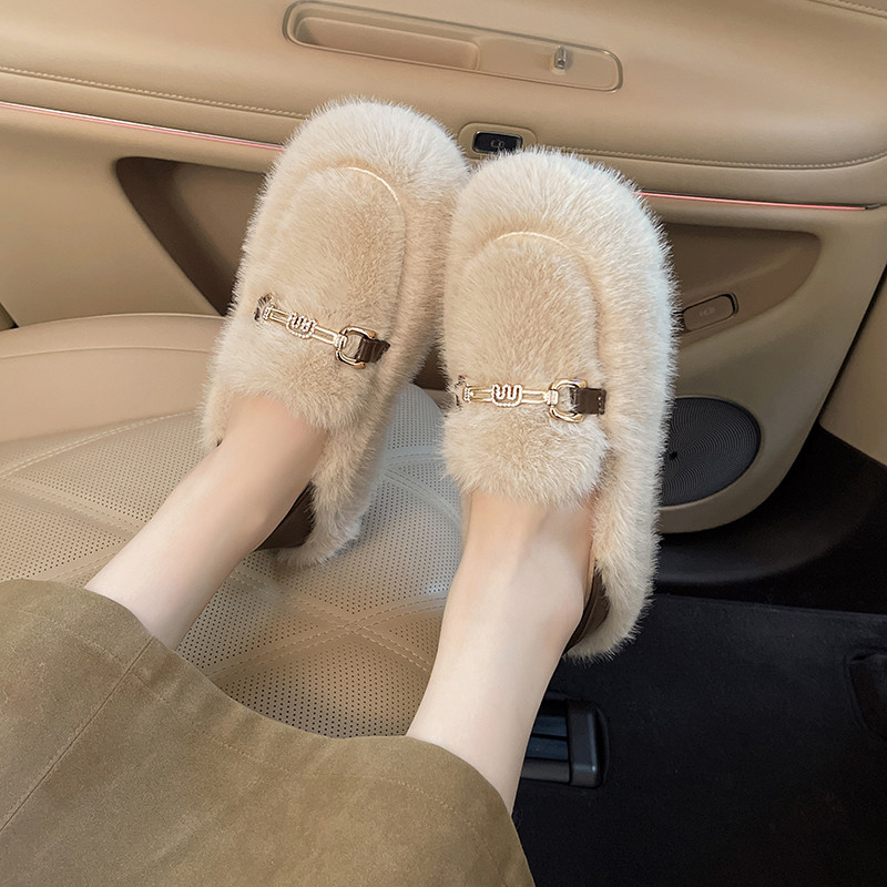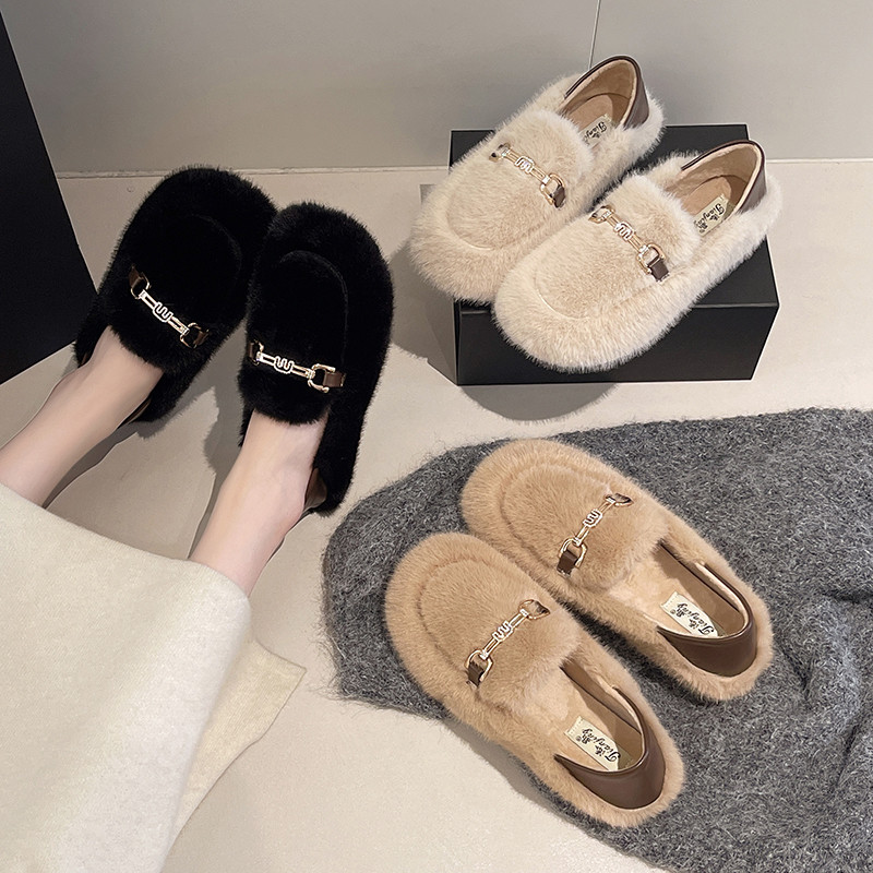 巨好看平底毛毛鞋女2025新款秋季一脚蹬毛绒玛丽珍豆豆鞋加绒棉鞋