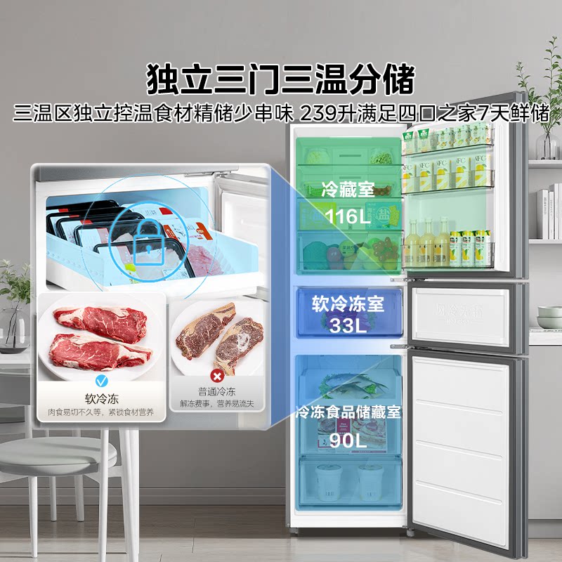 政府补贴海尔出品统帅三开门251L一级风冷无霜租房小型家用电冰箱