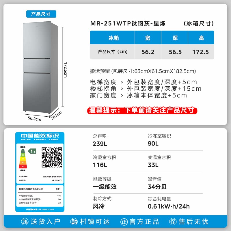 美的251三门无霜王冰箱家用超薄小户型租房一级节能省电风冷无霜