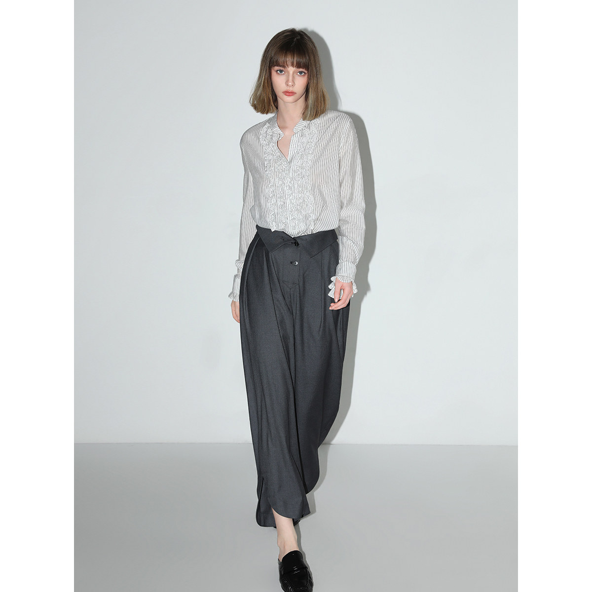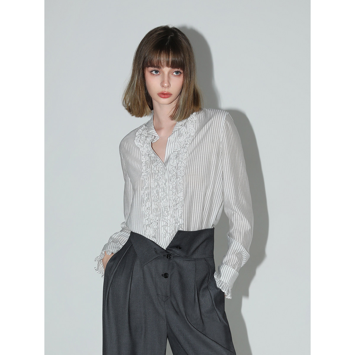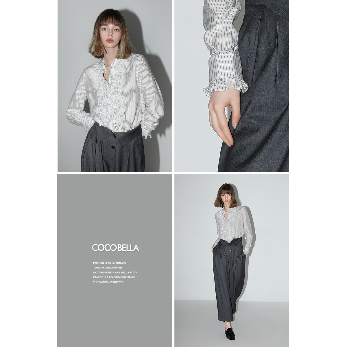 COCOBELLA重工立体木耳边立领条纹衬衫优雅花苞袖衬衣SR3033