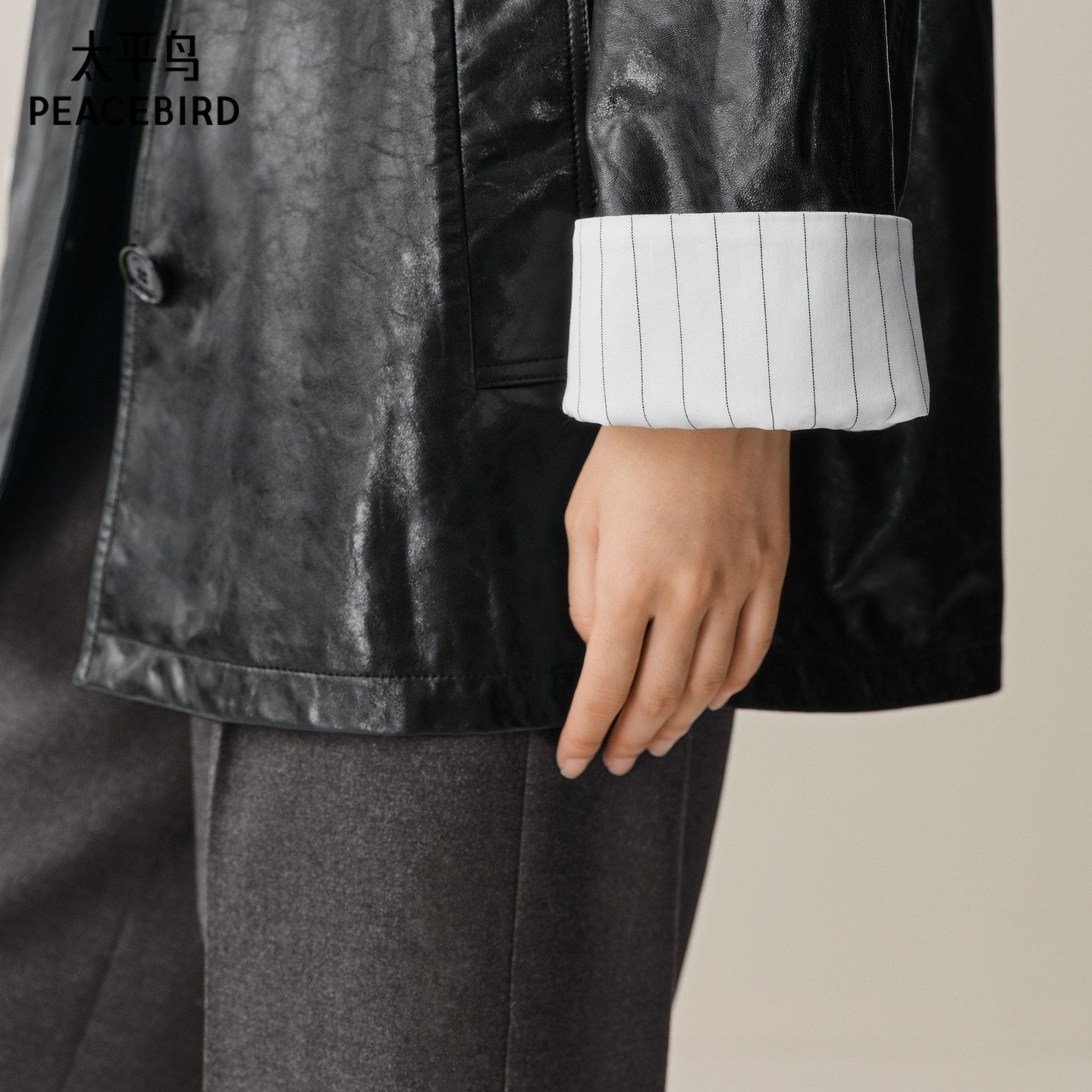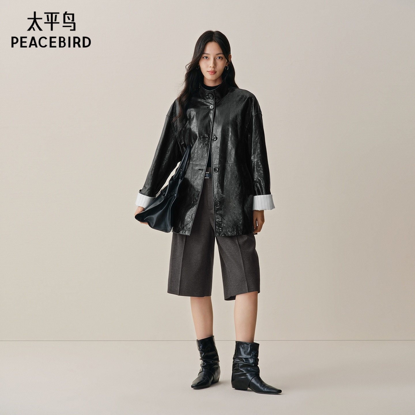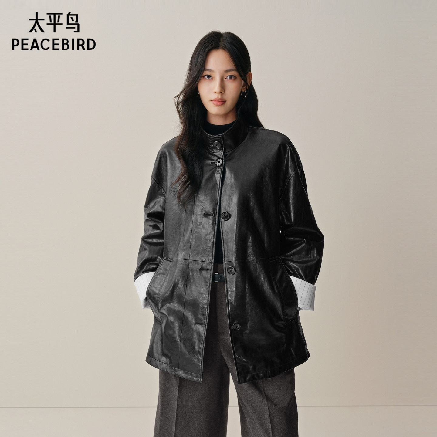 【商场同款】太平鸟优雅立领真皮皮衣宽松落肩外套女A1BDF4A05*