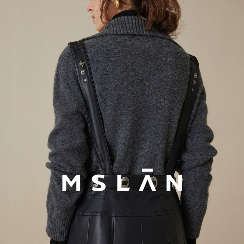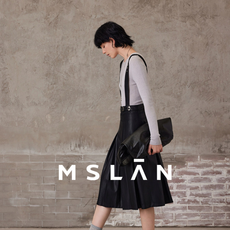 可两穿背带裙/ MSLAN早春都市优雅PU皮裙宽松压褶皮质半身裙