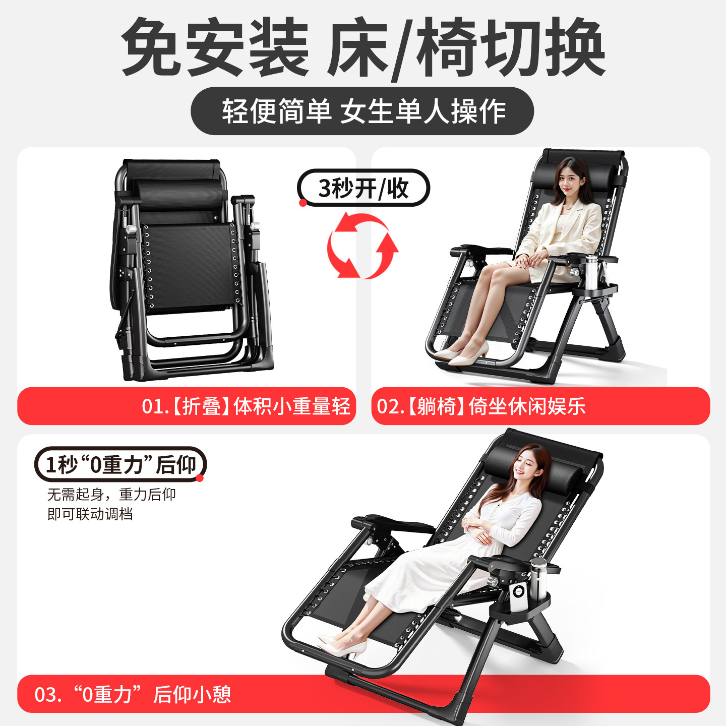 午休折叠躺椅办公室午睡床坐躺两用家用阳台休闲懒人沙发靠背椅子