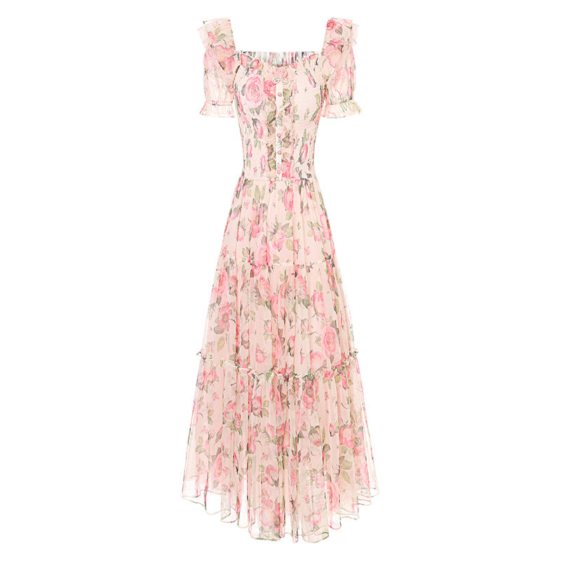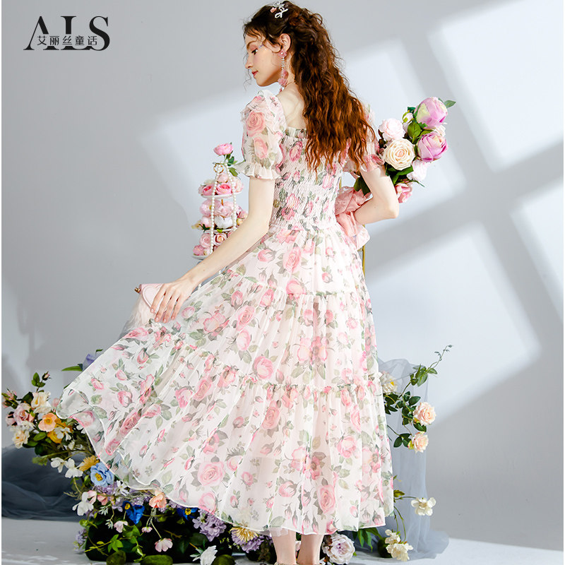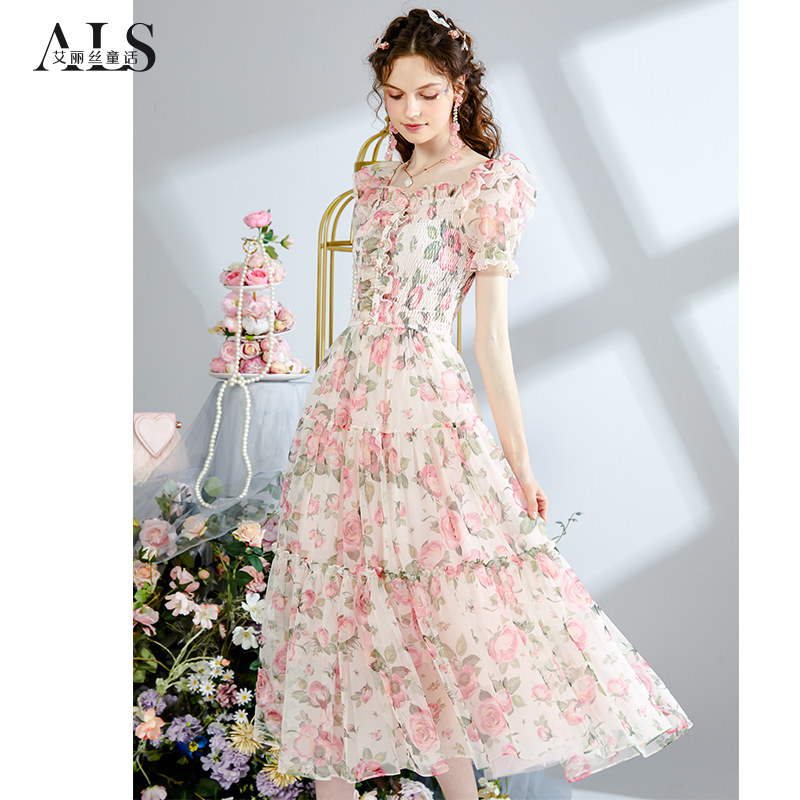 艾丽丝2025夏季新款仙气印花中长款连衣裙女甜美网纱蕾丝蛋糕裙女