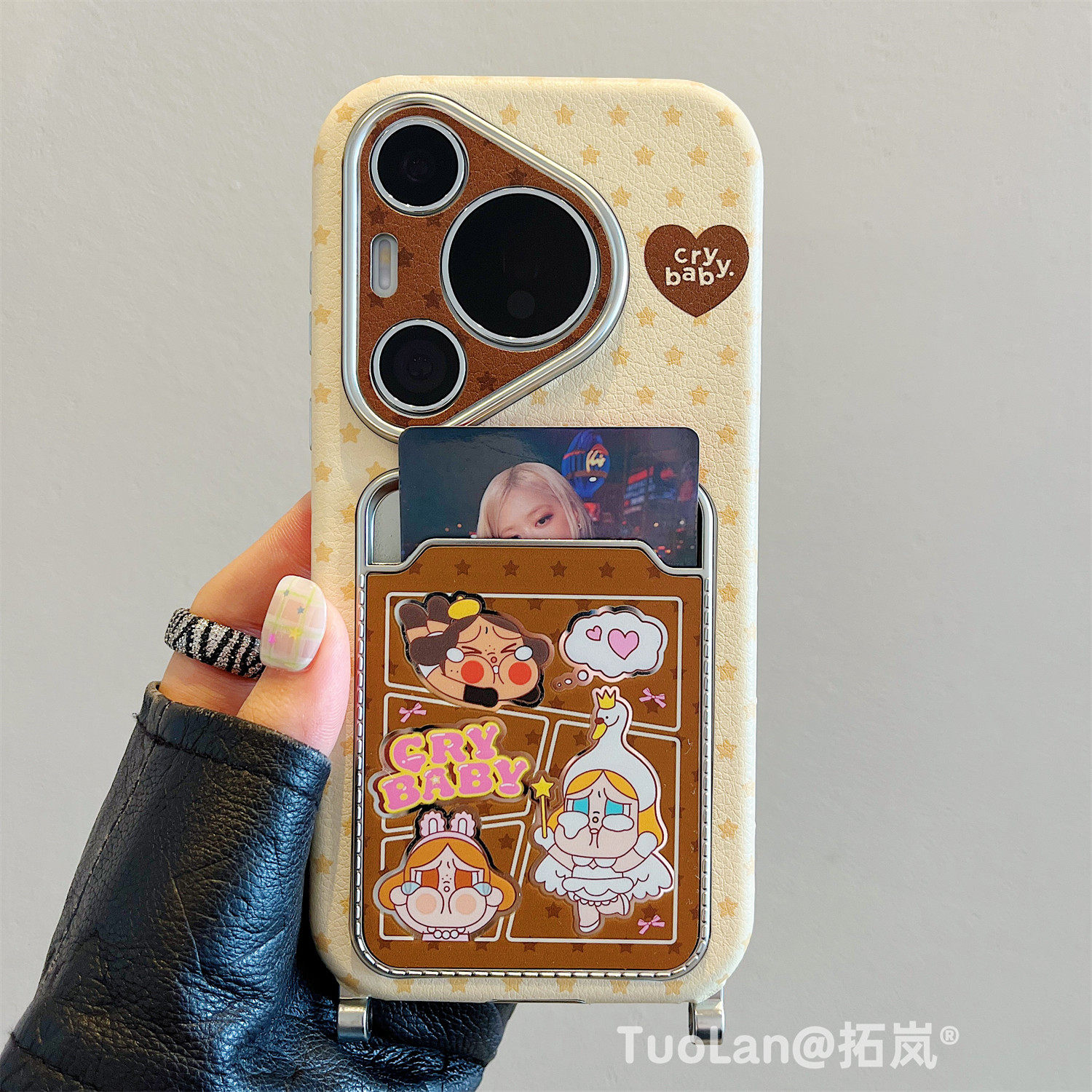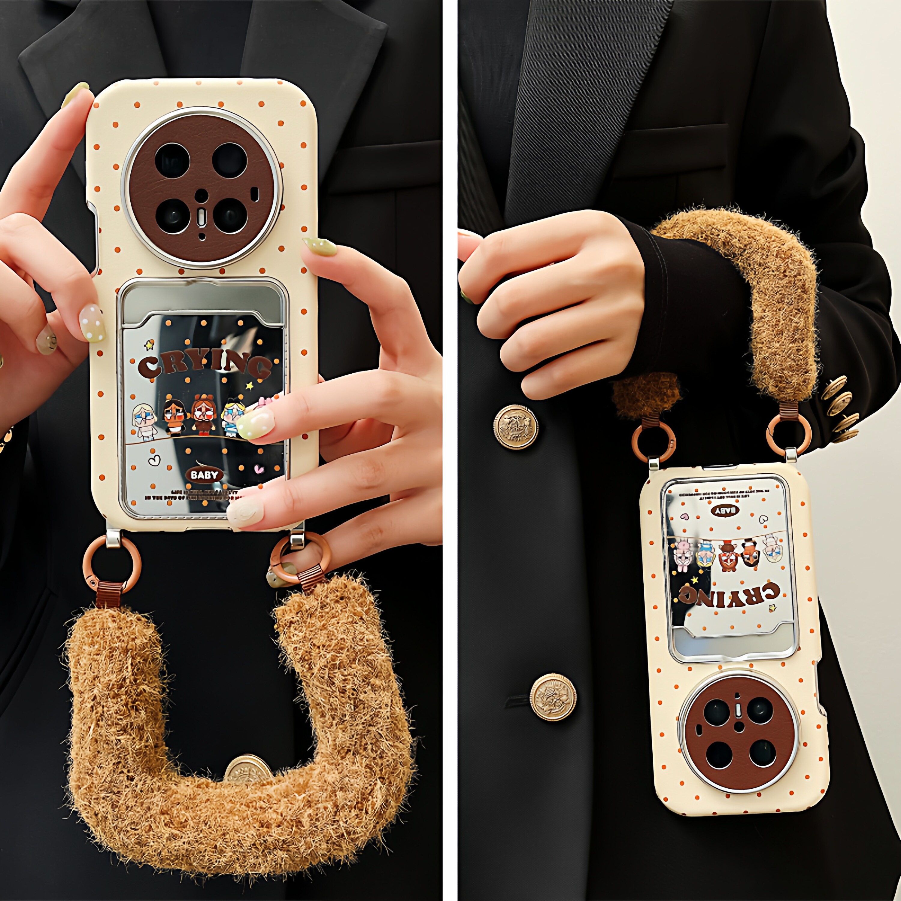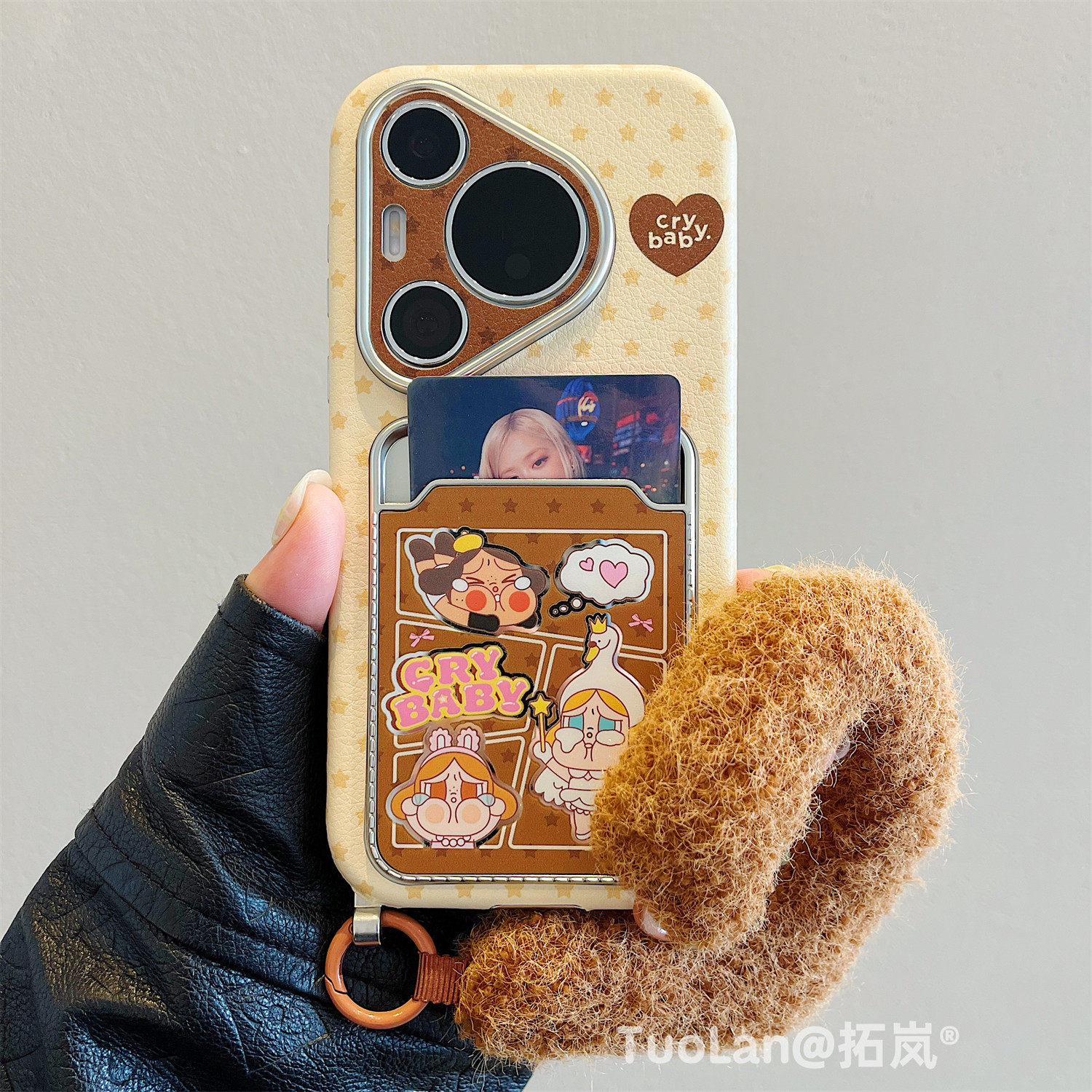 拓岚 适用华为pura70pro新款手机壳秋冬棕波点卡通哭娃公仔Pura80pro皮质卡套腕带挂绳斜跨mate70/60pro全包