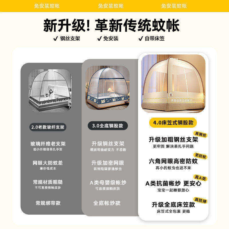 2026新款蚊帐全罩式儿童防摔床笠款蒙古包家用卧室免安装床上帐篷