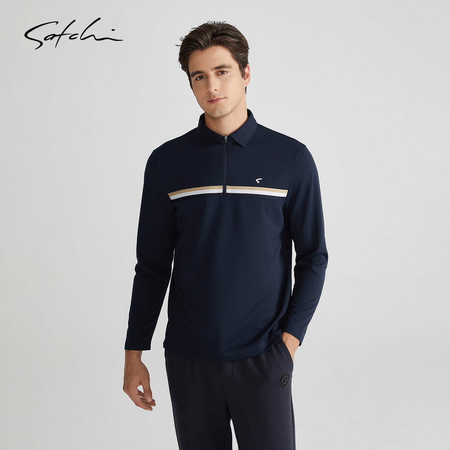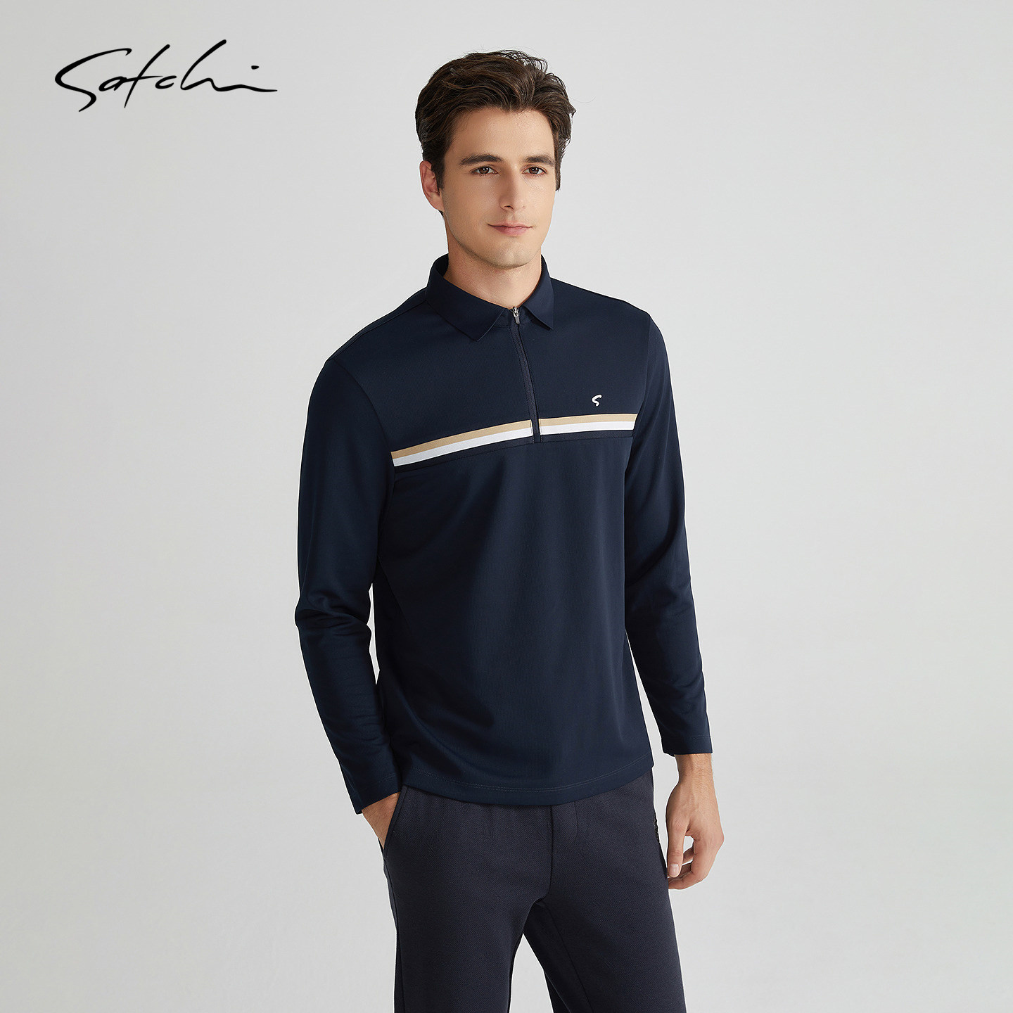 [拉链领]SATCHI沙驰男装男士长袖POLO衫春季新款运动商务速干T恤