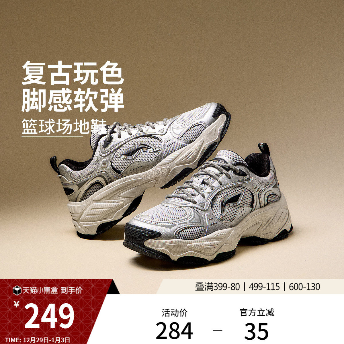 李宁红糖2丨休闲鞋男鞋冬季新款复古老爹鞋厚底增高银色运动鞋子
