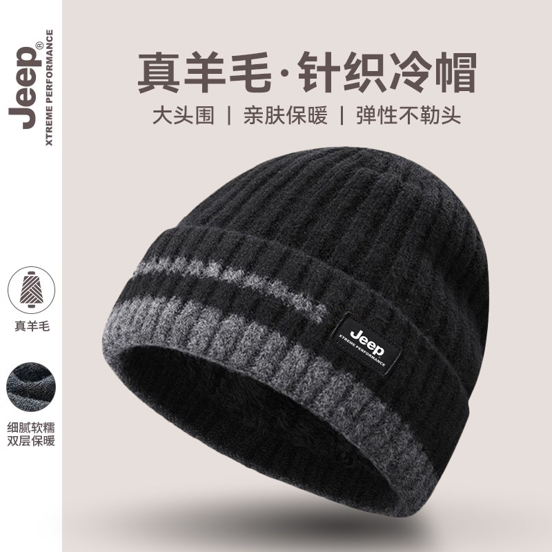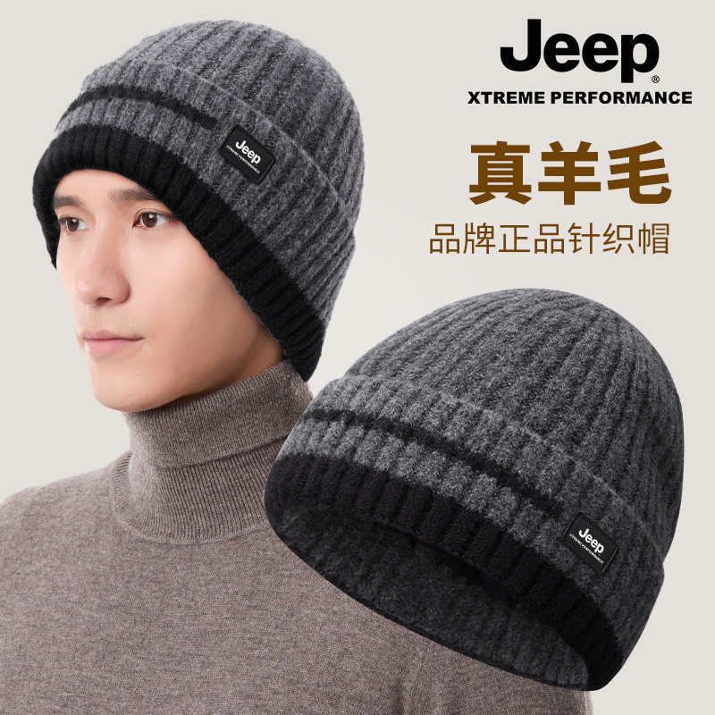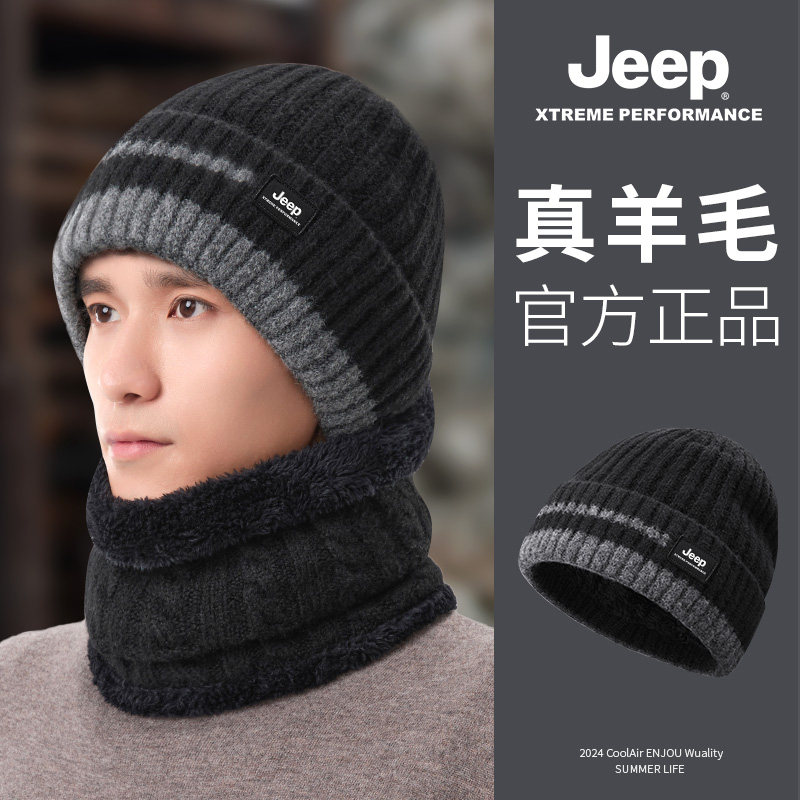 jeep吉普保暖冬季羊毛帽子男士针织毛线冷帽加绒防风围脖护颈男冬