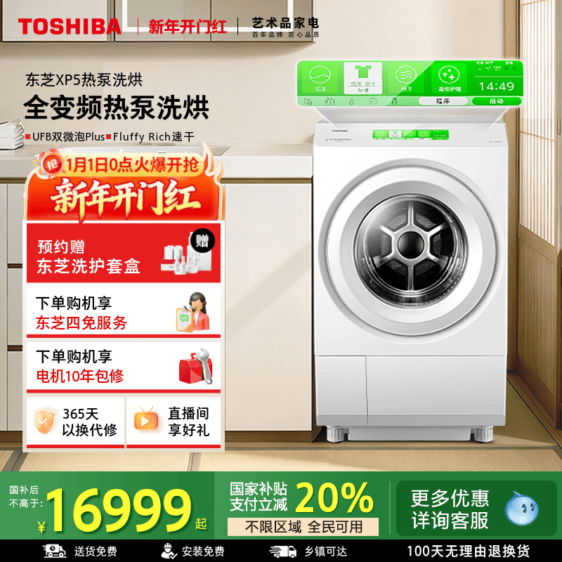 【海外同款XP5】东芝热泵全变频洗烘一体机12KG大容量滚筒洗衣机