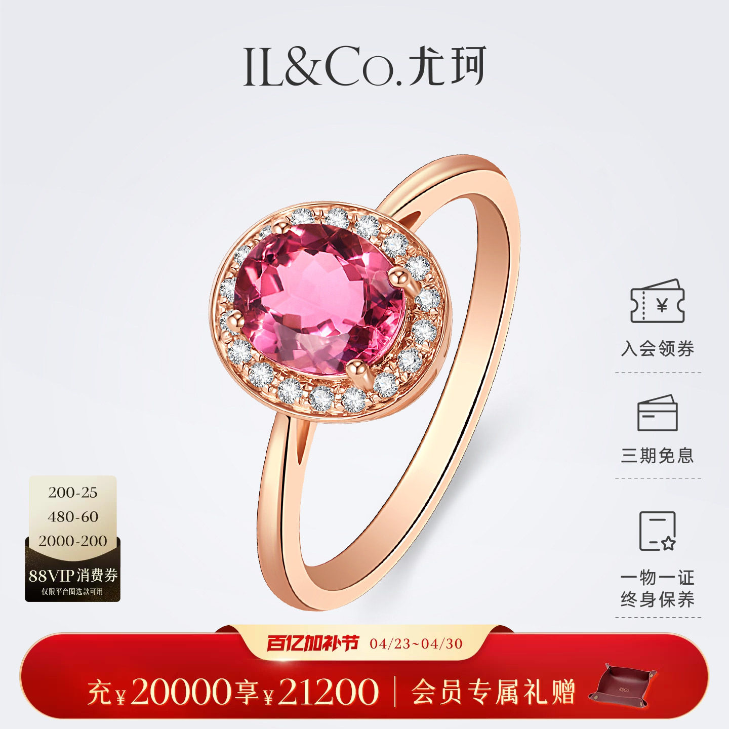 ILCO尤珂 红18K金天然彩色宝石戒指复古钻石镶嵌粉碧玺彩宝女款戒