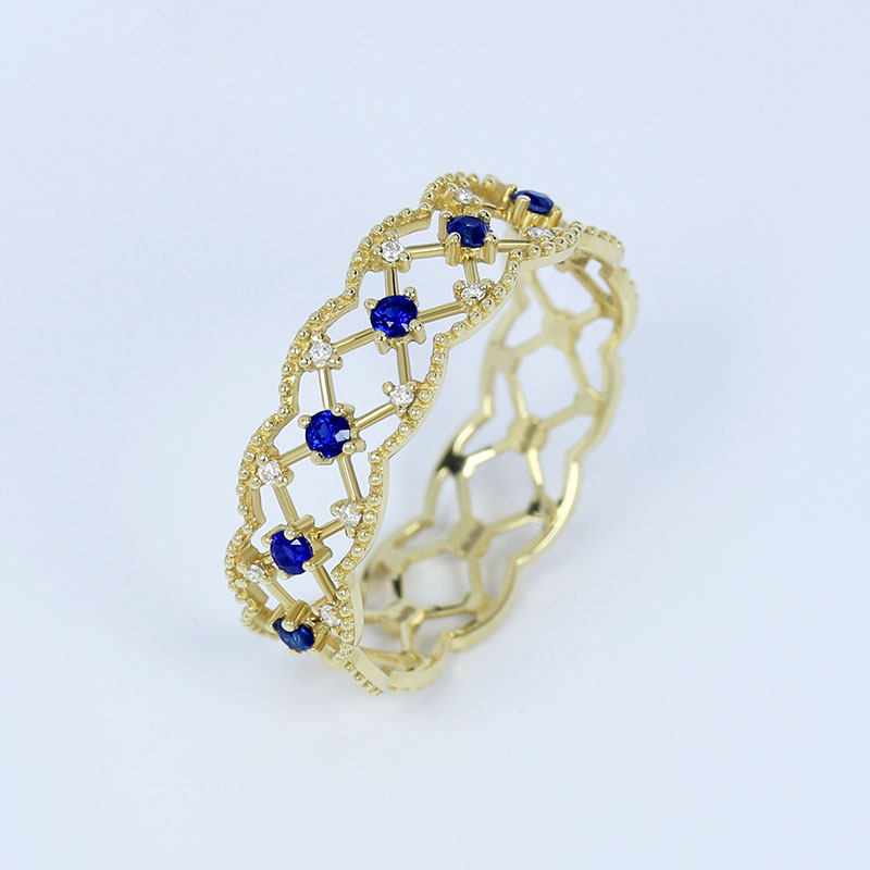 加厚18k黄金天然蓝宝石钻石戒指 精美彩宝复古镂空蕾丝珠边女指环