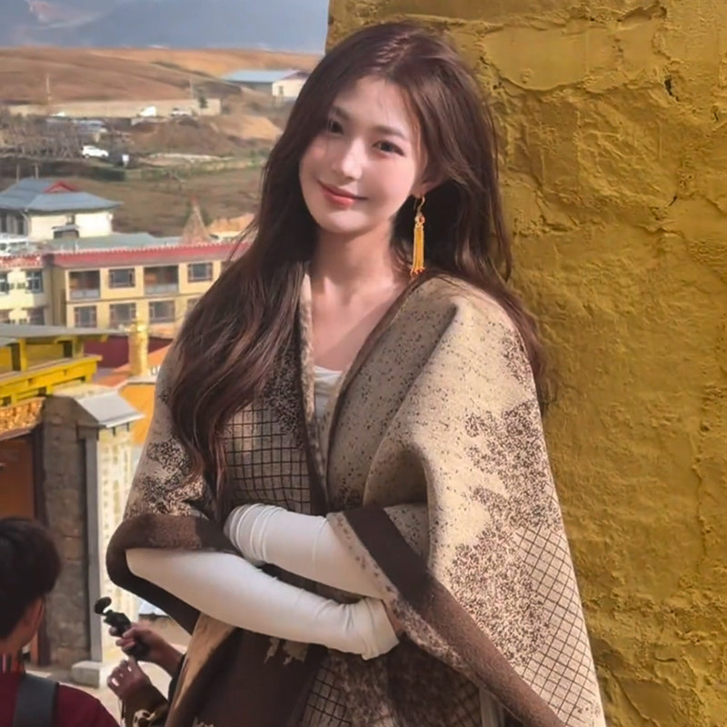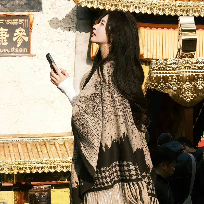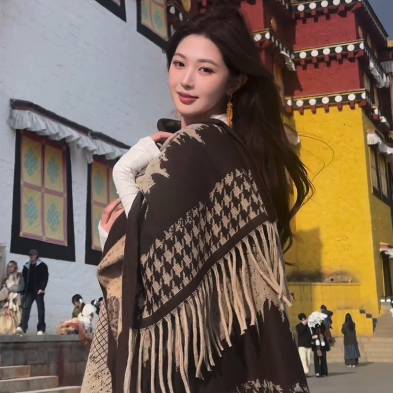民族风渐变千鸟格披肩女外搭秋冬季保暖斗篷新款围巾流苏百搭披风