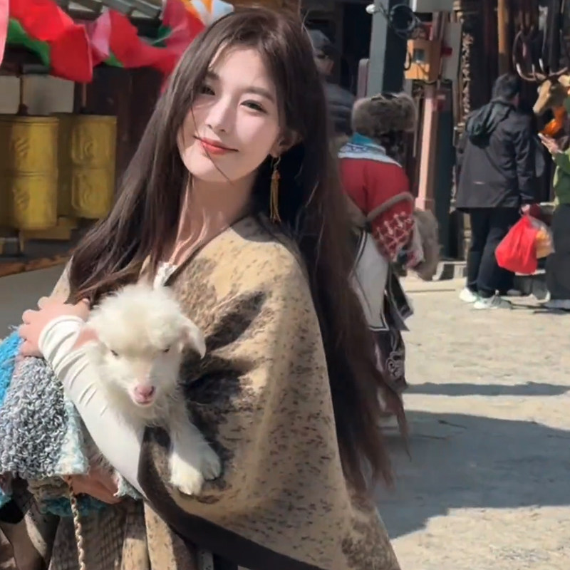 云南丽江民族风蓝色旅游披肩女外搭氛围感时尚披风斗篷针织围巾女