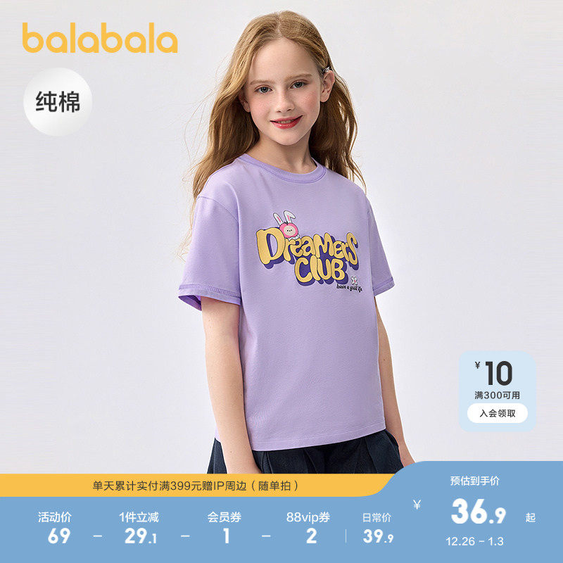 巴拉巴拉童装儿童短袖t恤女童2025新款夏装大童速干甜美纯棉上衣