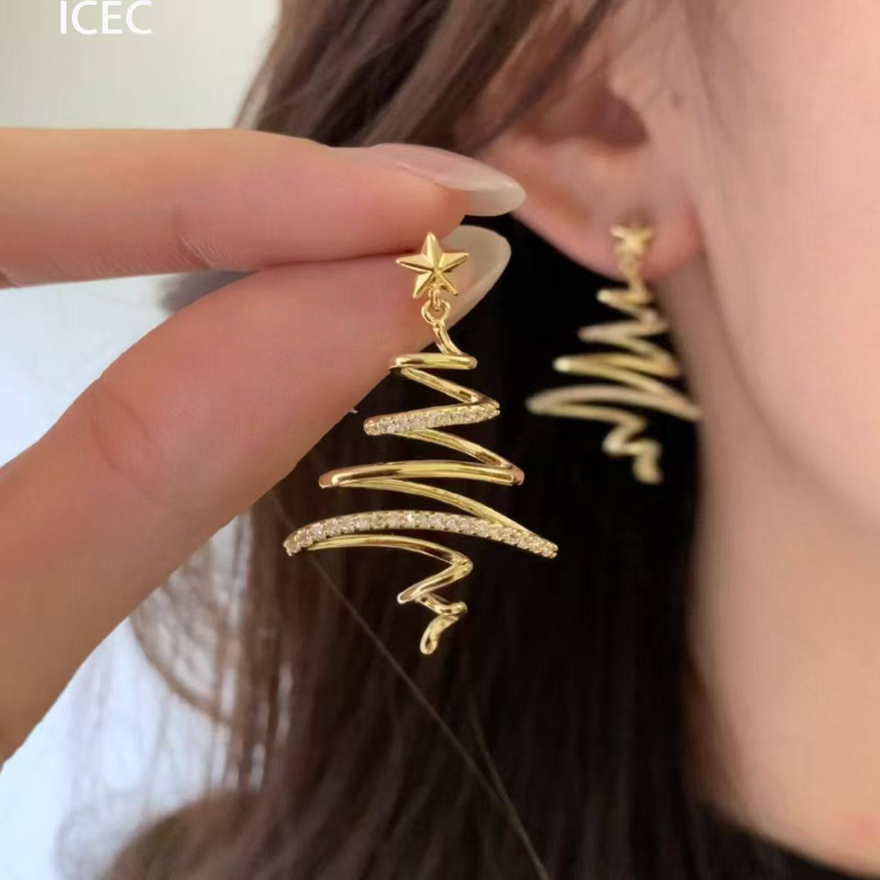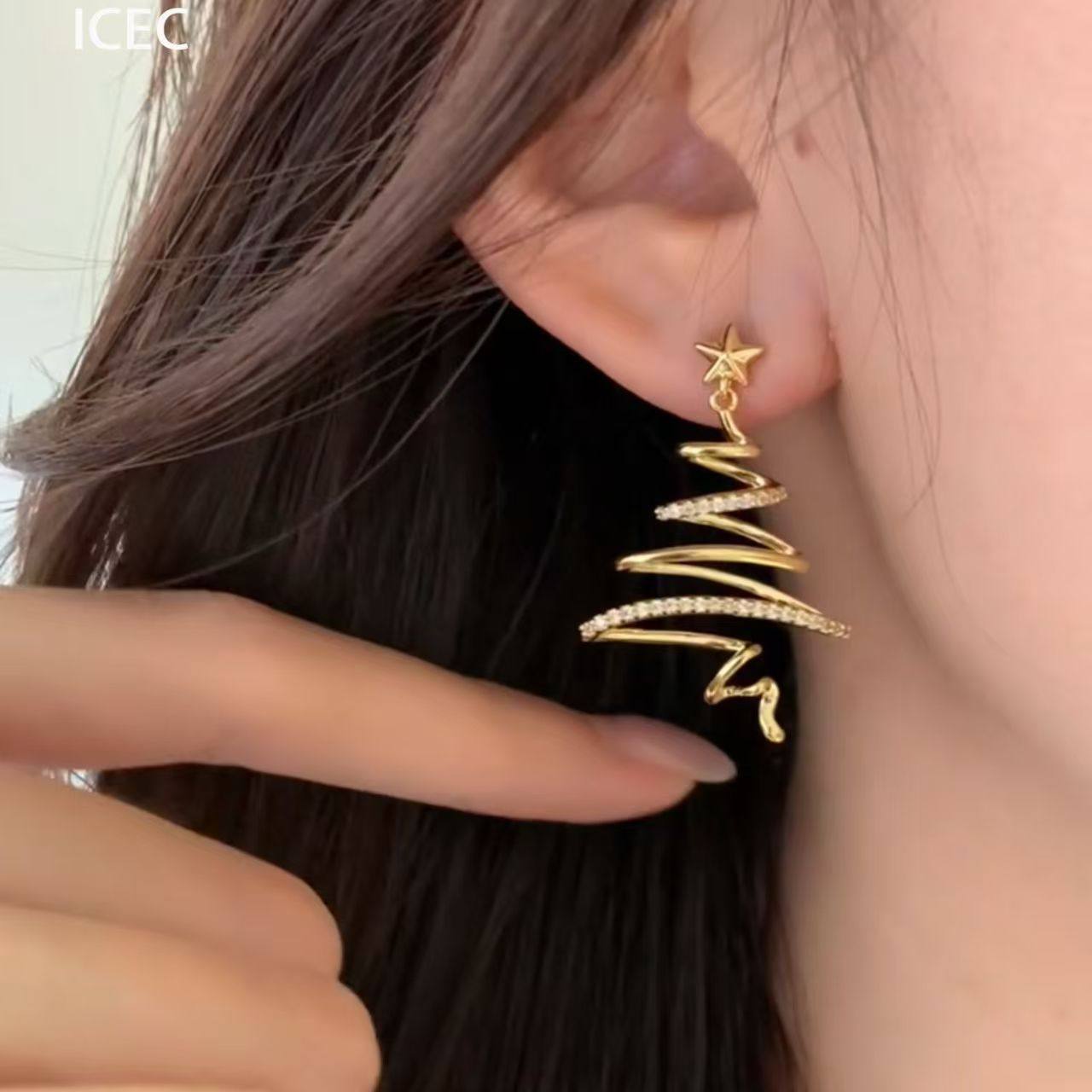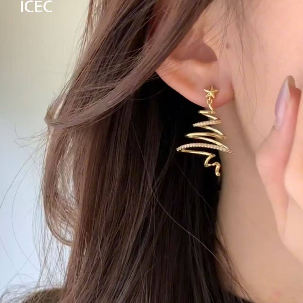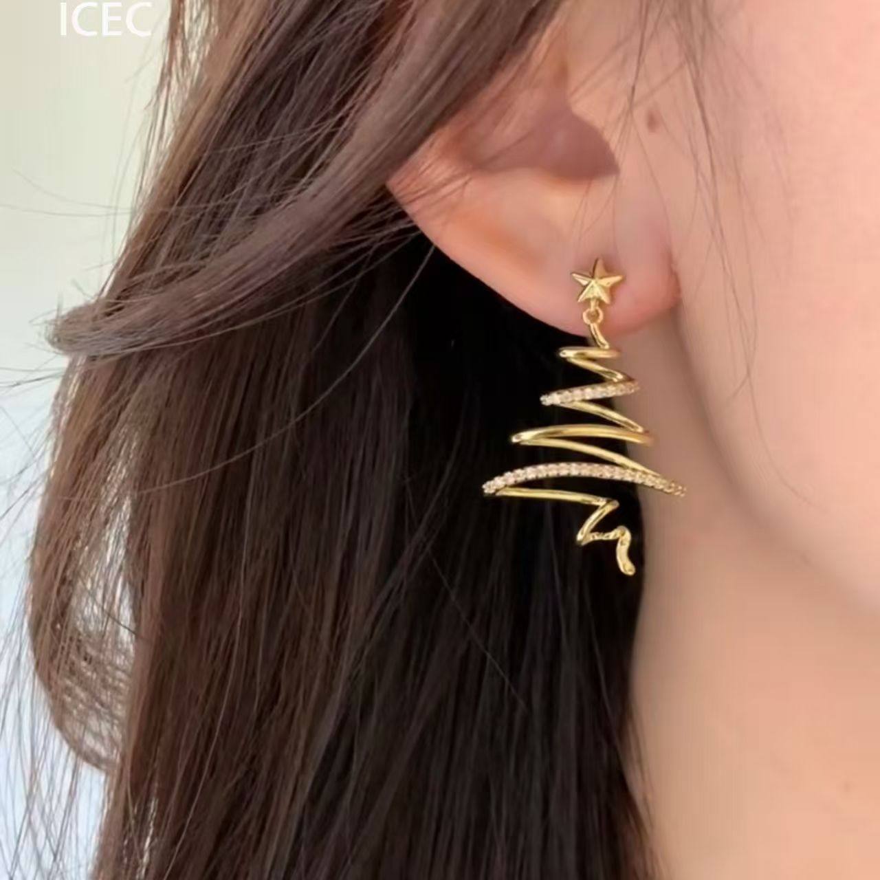 爆闪圣诞树星星耳钉无耳洞耳夹女轻奢高级感小众方圆脸秋冬耳饰