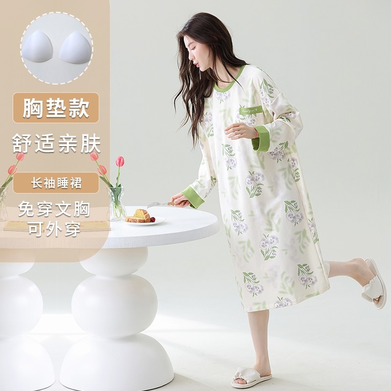 秋冬超火睡裙女士带胸垫一体式2025新款长袖大码宽松外穿睡衣裙