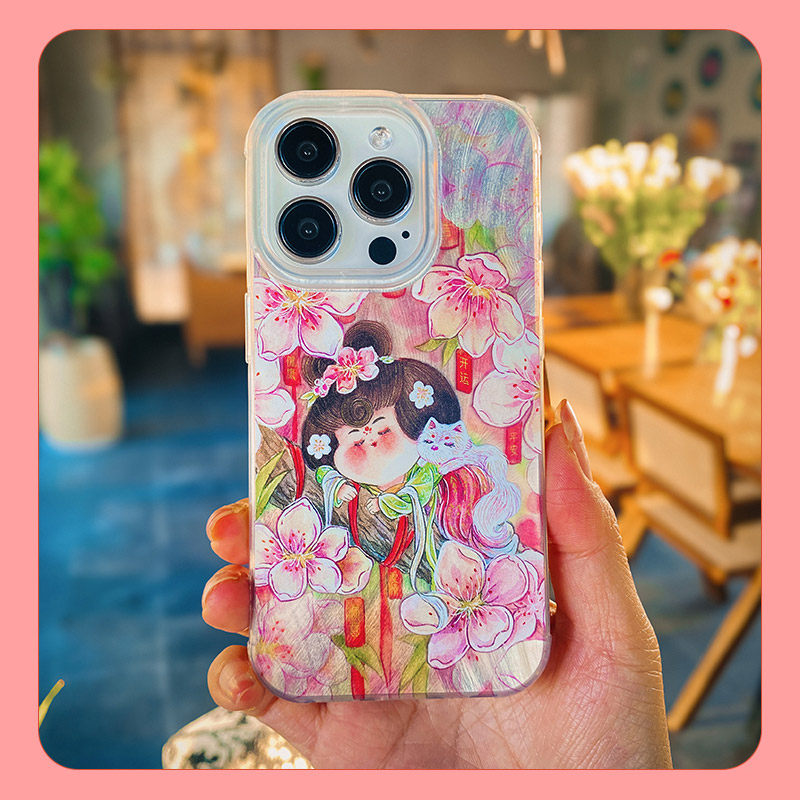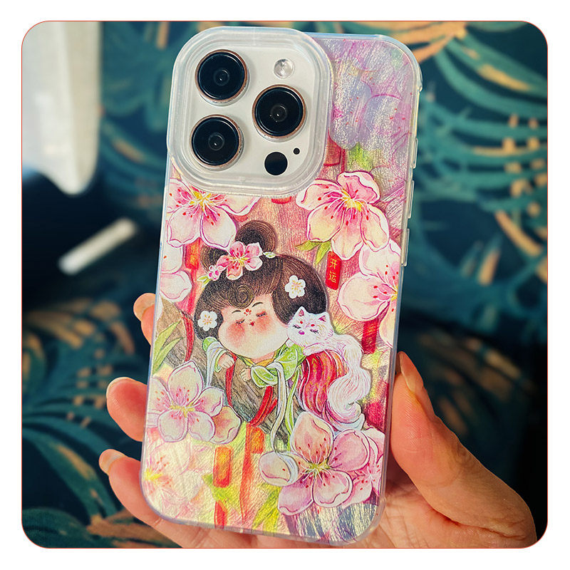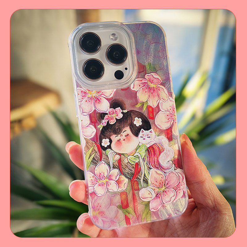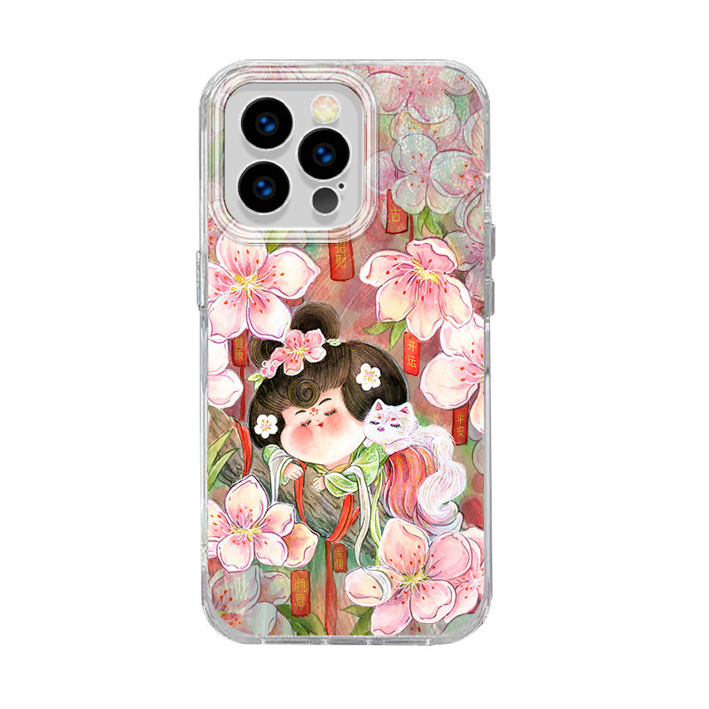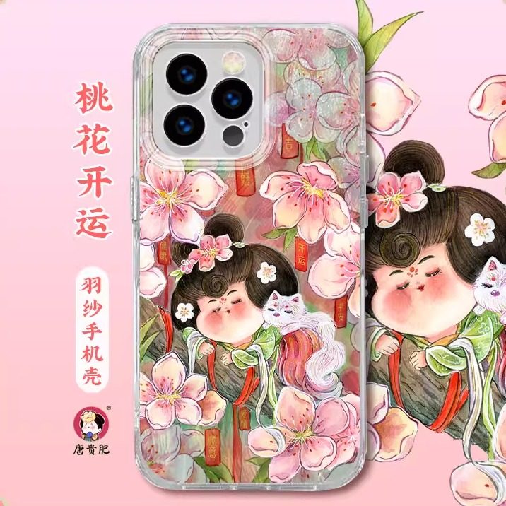 唐贵肥原创适用iPhone苹果17手机壳15新款14羽纱硬壳镜头全包防摔华为mate70新中式pura80桃花粉好运可爱卡通