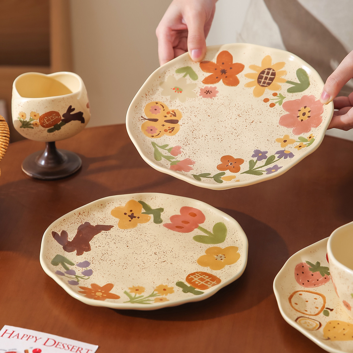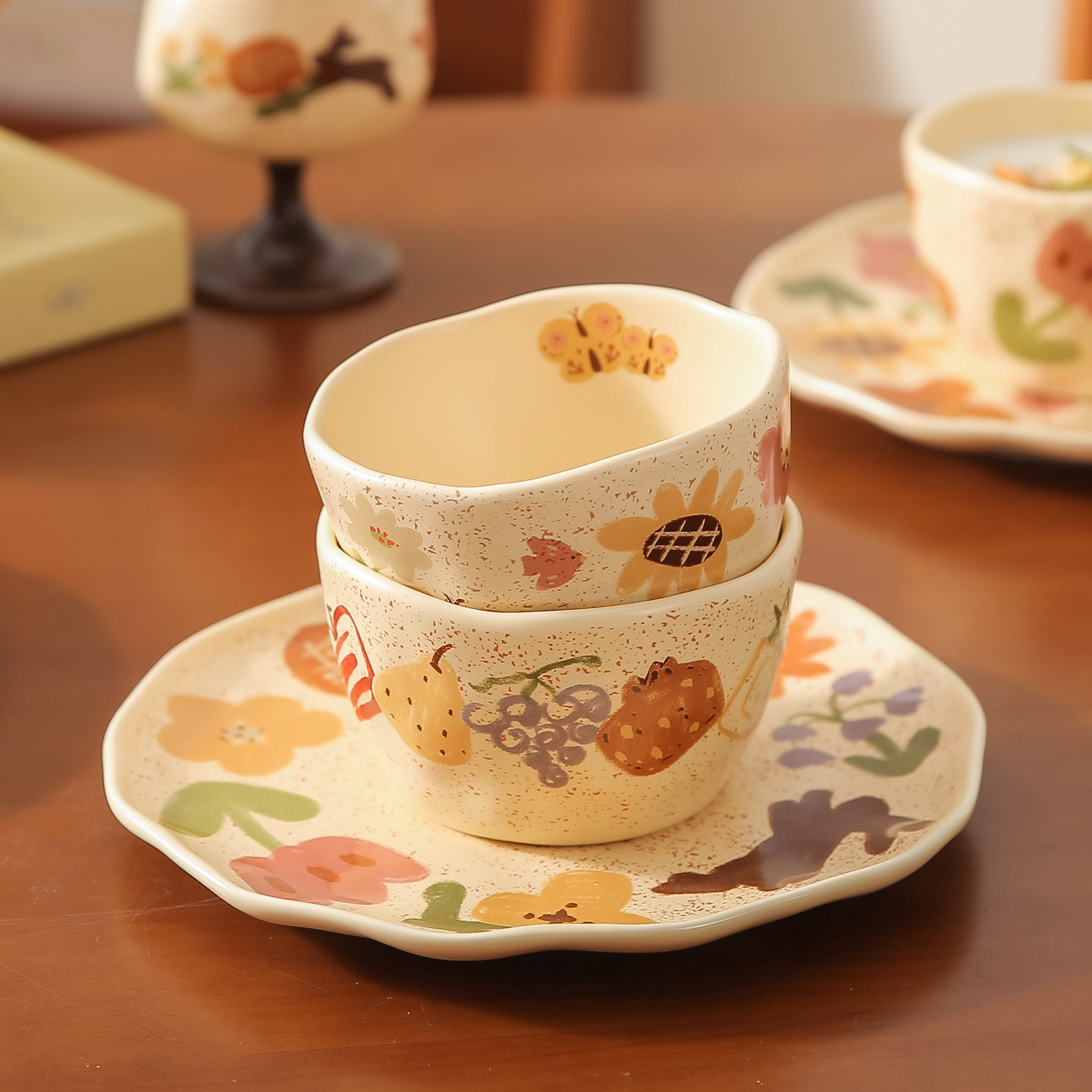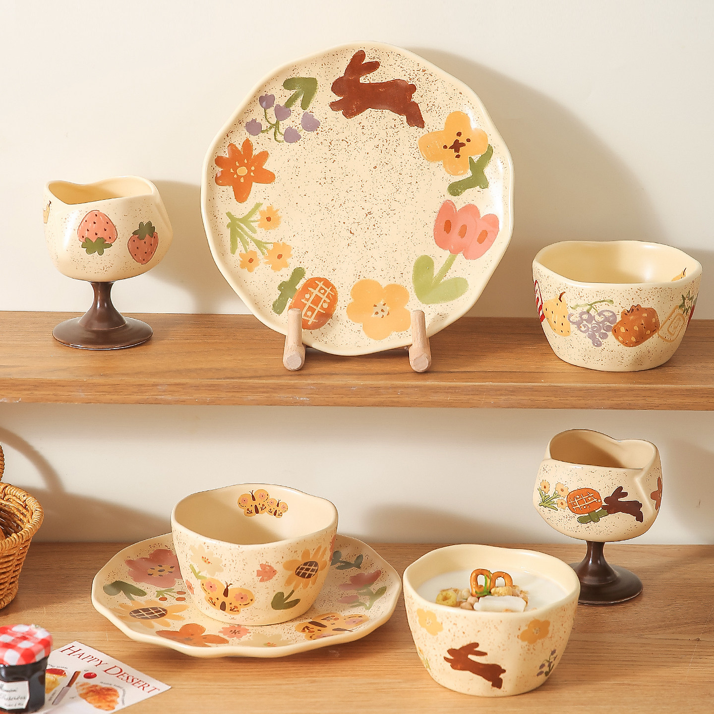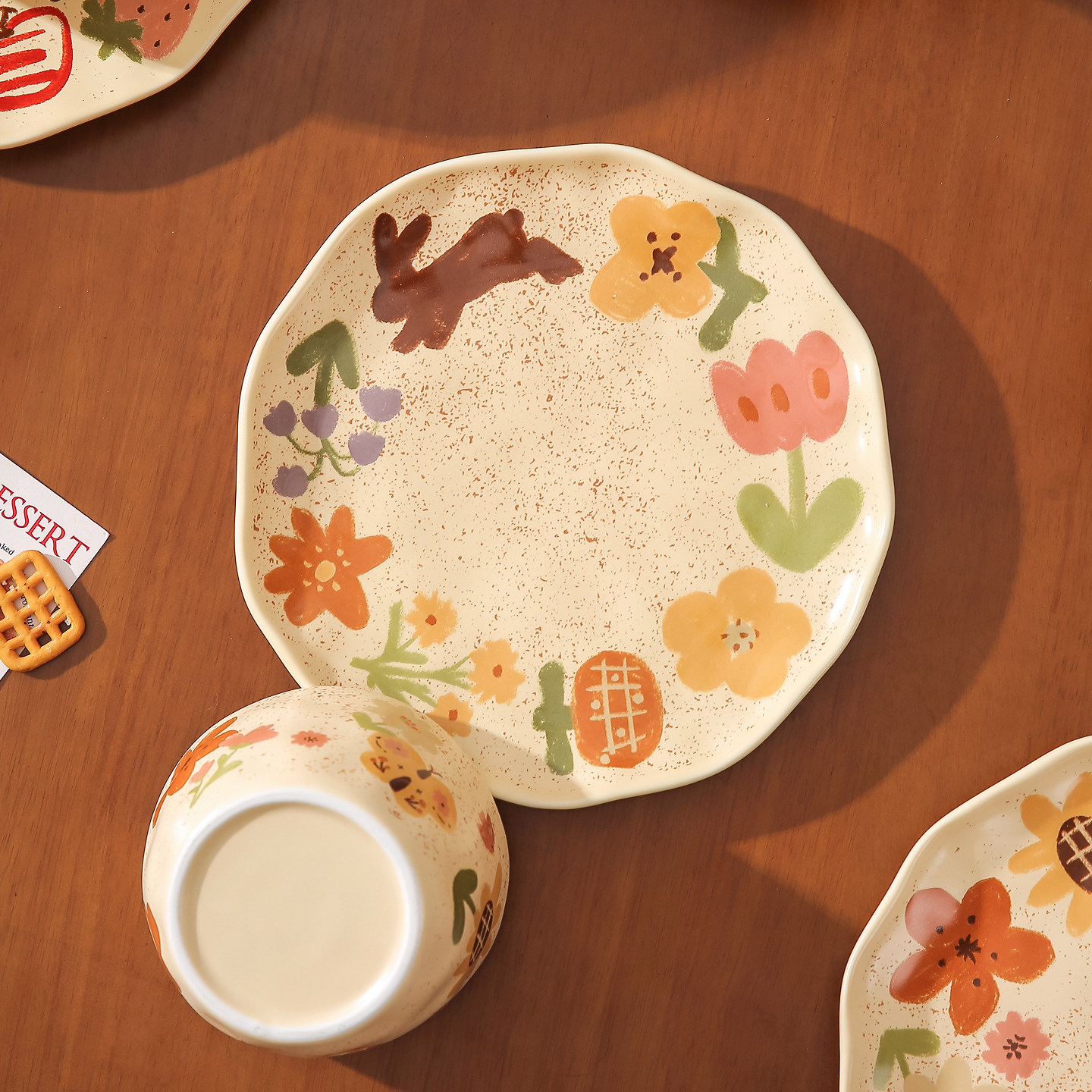 奶油风陶瓷碗家用卡通菜盘子可爱米饭碗汤碗釉下彩儿童餐具耐高温