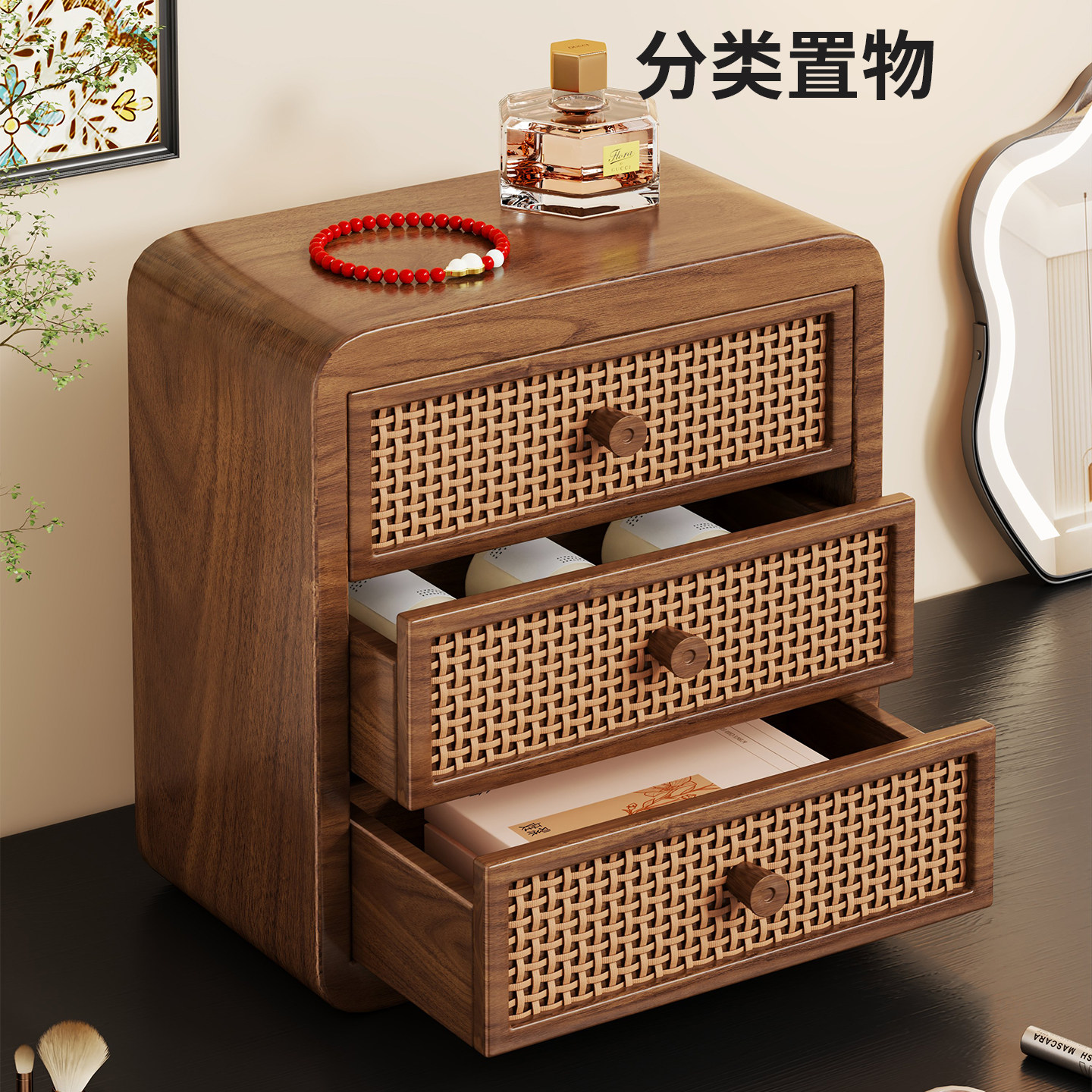 实木桌面收纳盒化妆品梳妆台口红首饰香水展示架桌面护肤品储物盒