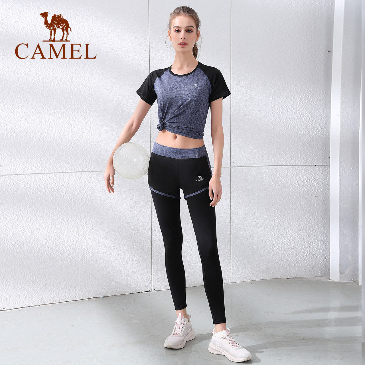 骆驼女装休闲运动套装女夏季跑步健身瑜伽服短袖T恤瑜伽裤两件套