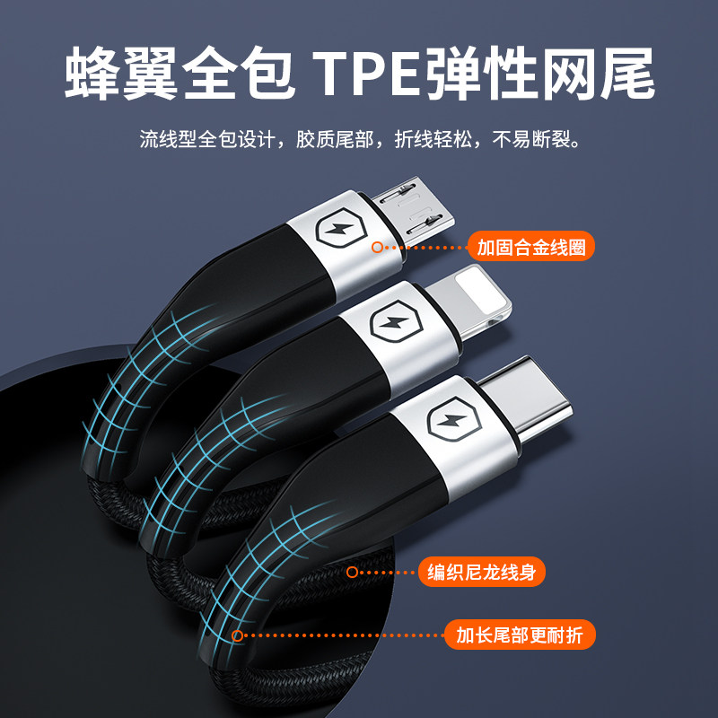 【100W超级快充】数据线三合一拖三充电器一拖3车载通用手机usb多头二用多功能适用华为苹果typec安卓6A