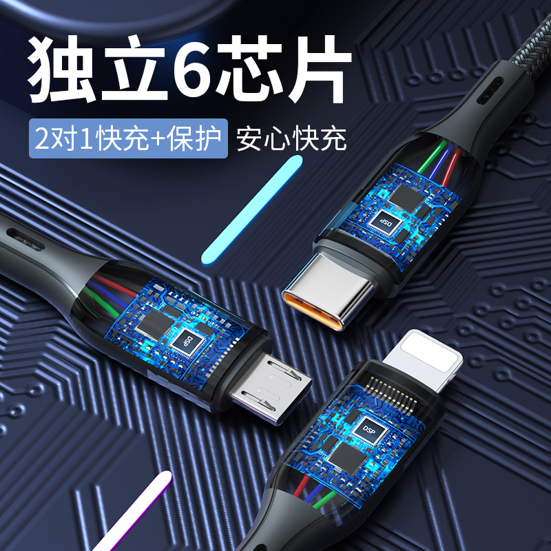 超级快充三合一数据线通用充电线适用苹果荣耀华为OPPO小米VIVO手机通用车载一拖三数据线透明芯片type-c带灯