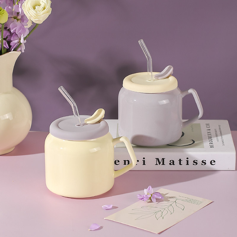 川岛屋奶油风杯子陶瓷带盖吸管马克杯女生高颜值家用办公室喝水杯