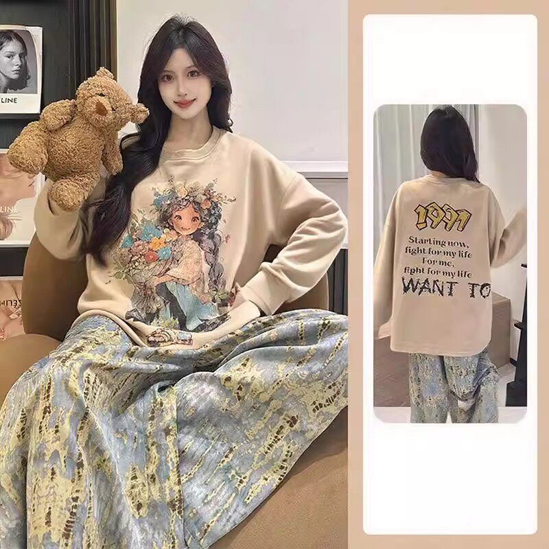 2025新款秋季睡衣女士长袖带胸垫长裤束脚家居服爆款套装女可外穿