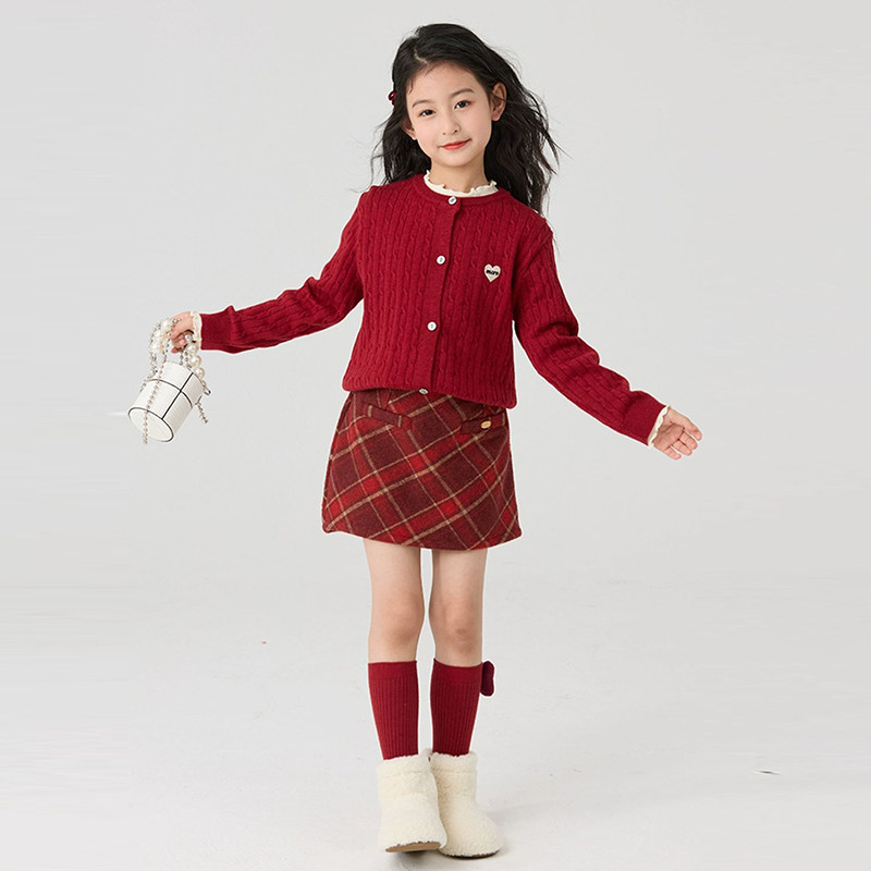 女童新年半身裙秋冬季儿童年服复古红色格子短裙女孩冬装包臀裙子