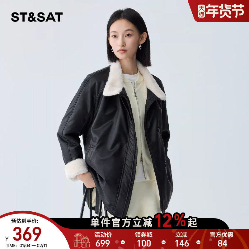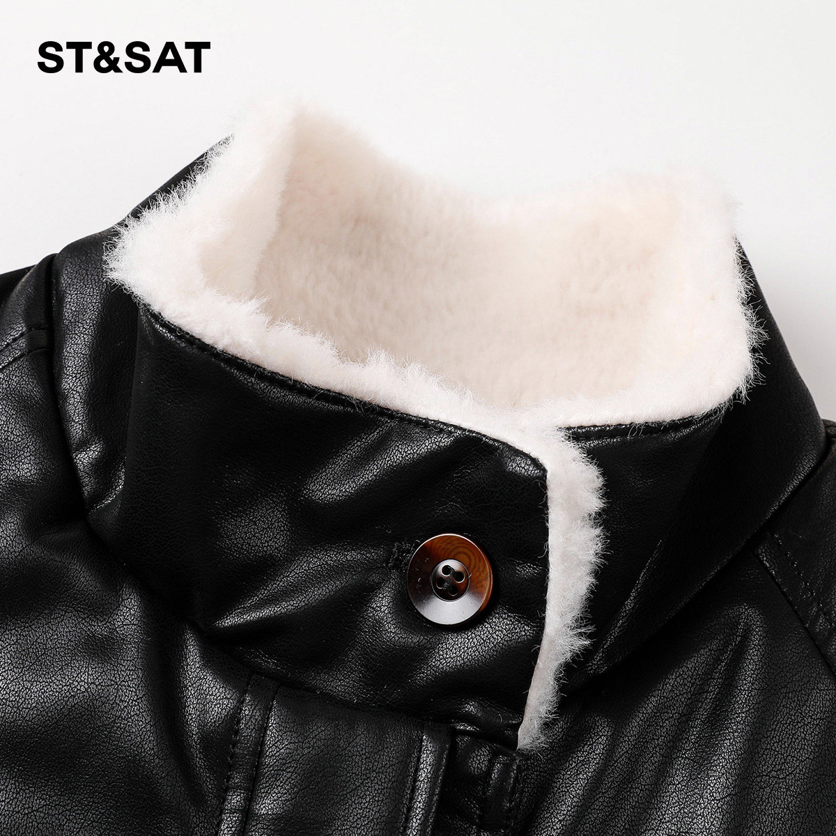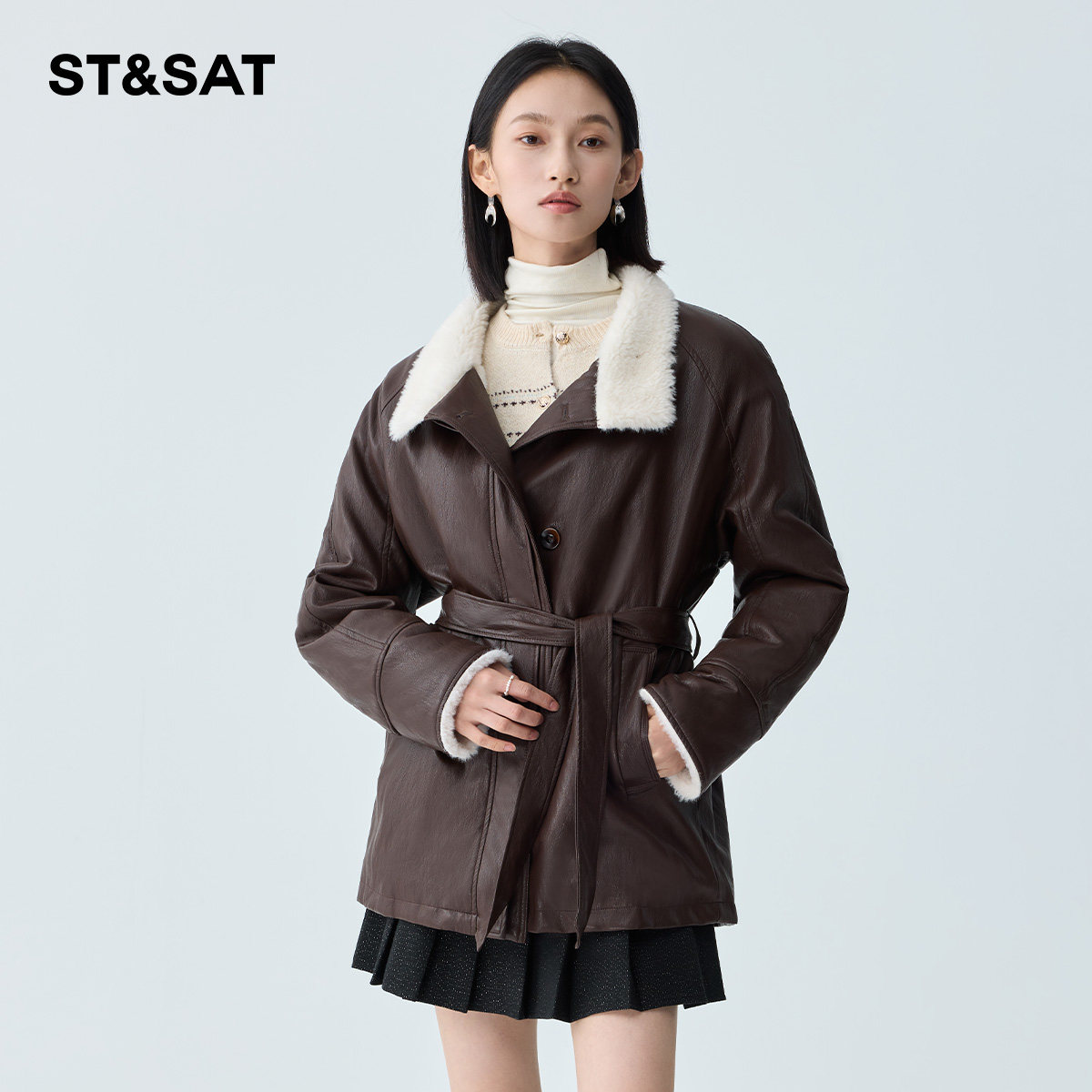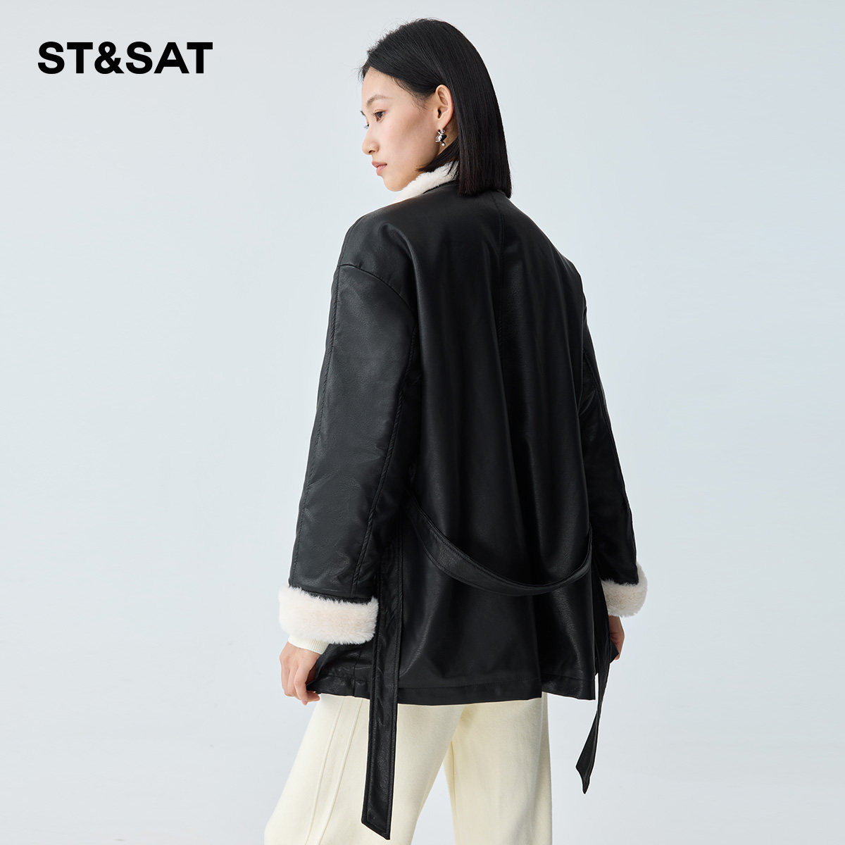 星期六摩登中长款加绒PU皮衣女春季新款复古宽松腰带风衣外套